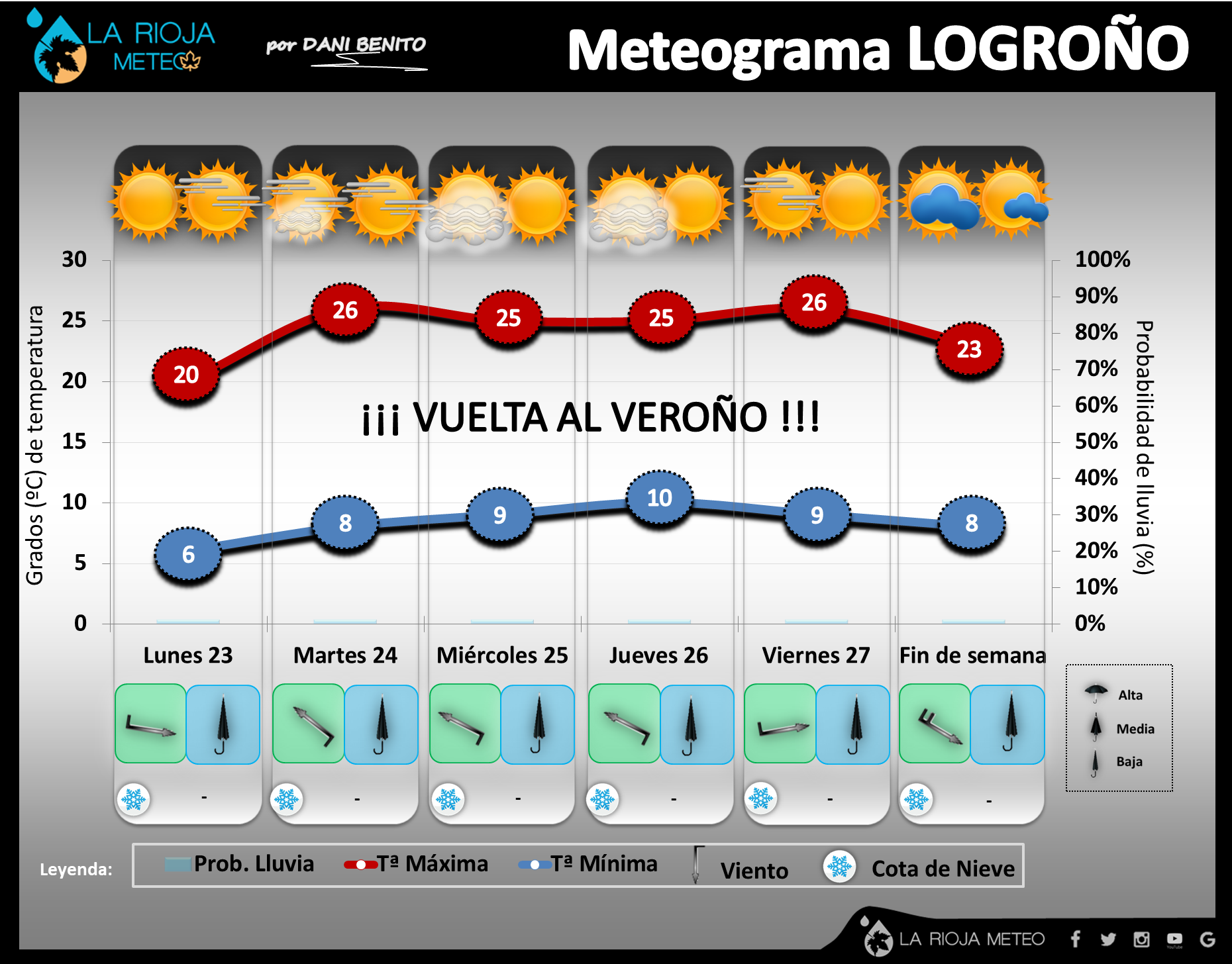 Poco que contar salvo que el sol y el calor dominarán en toda la geografía riojana, a excepción de las posibles nieblas que puedan aparecer en la ribera en los días centrales de la semana. Recuerda: