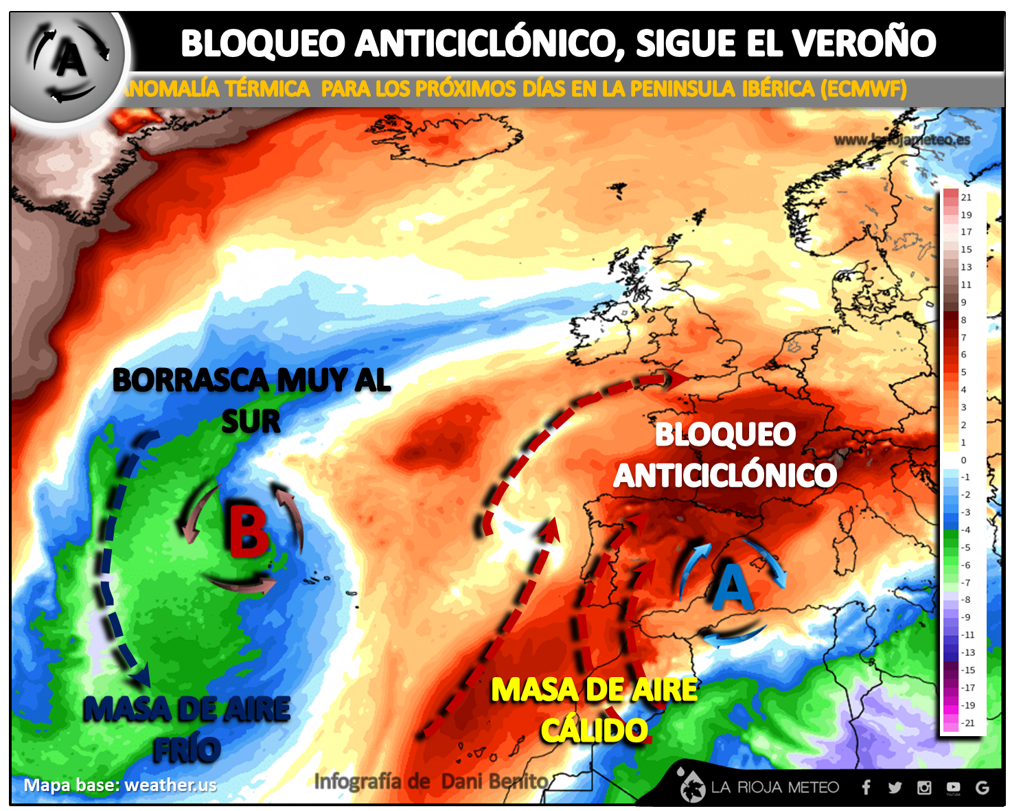Es por ello por lo que se registran estas importantes anomalías térmicas en nuestro entorno, pues ambos sistemas favorecen la creación de un pasillo de aire procedente del norte del continente africano, pasillo que sigue alimentando a la Peninsula Ibérica de aire cálido debido a la persistencia de la situación, aire que tiende a recalentarse cada vez más….de ahí que la situación empeore con el paso de los días.
