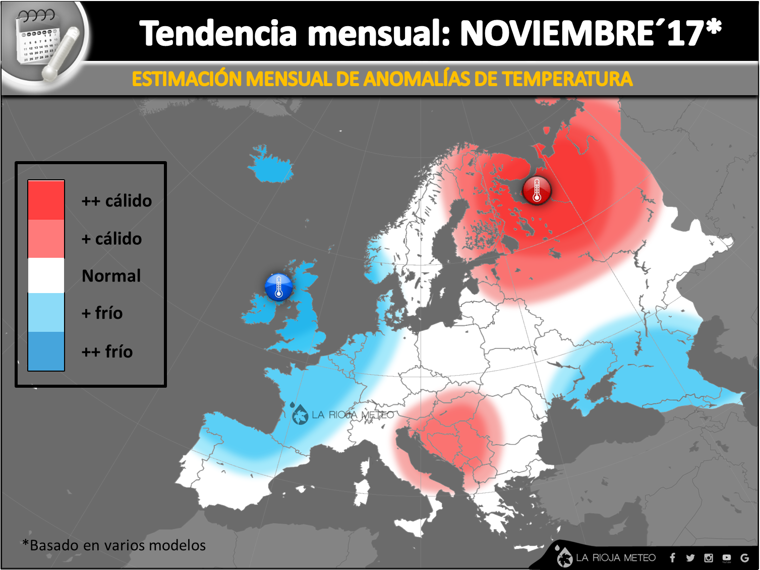 La incidencia de los vientos del norte, probablemente predominantes en la península Ibérica al menos en la primera quincena del mes, arrojará anomalías negativas de temperatura en toda la fachada atlántica europea. El descuelgue de borrascas vía Atlántico norte dejará un ambiente más frío especialmente en Inglaterra, los Países Bajos, Oeste de Francia, NorOeste de España y Norte de Portugal. Por el contrario, la probable presencia de borrascas en el entorno de la Península Ibérica y Mediterráneo occidental propiciaría que masa de aire más calientes asciendan hasta los extremos más septentrionales del continente, dejando bastante más calor de lo habitual en el entorno de Finlandia y el extremo noroccidental ruso.