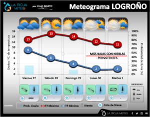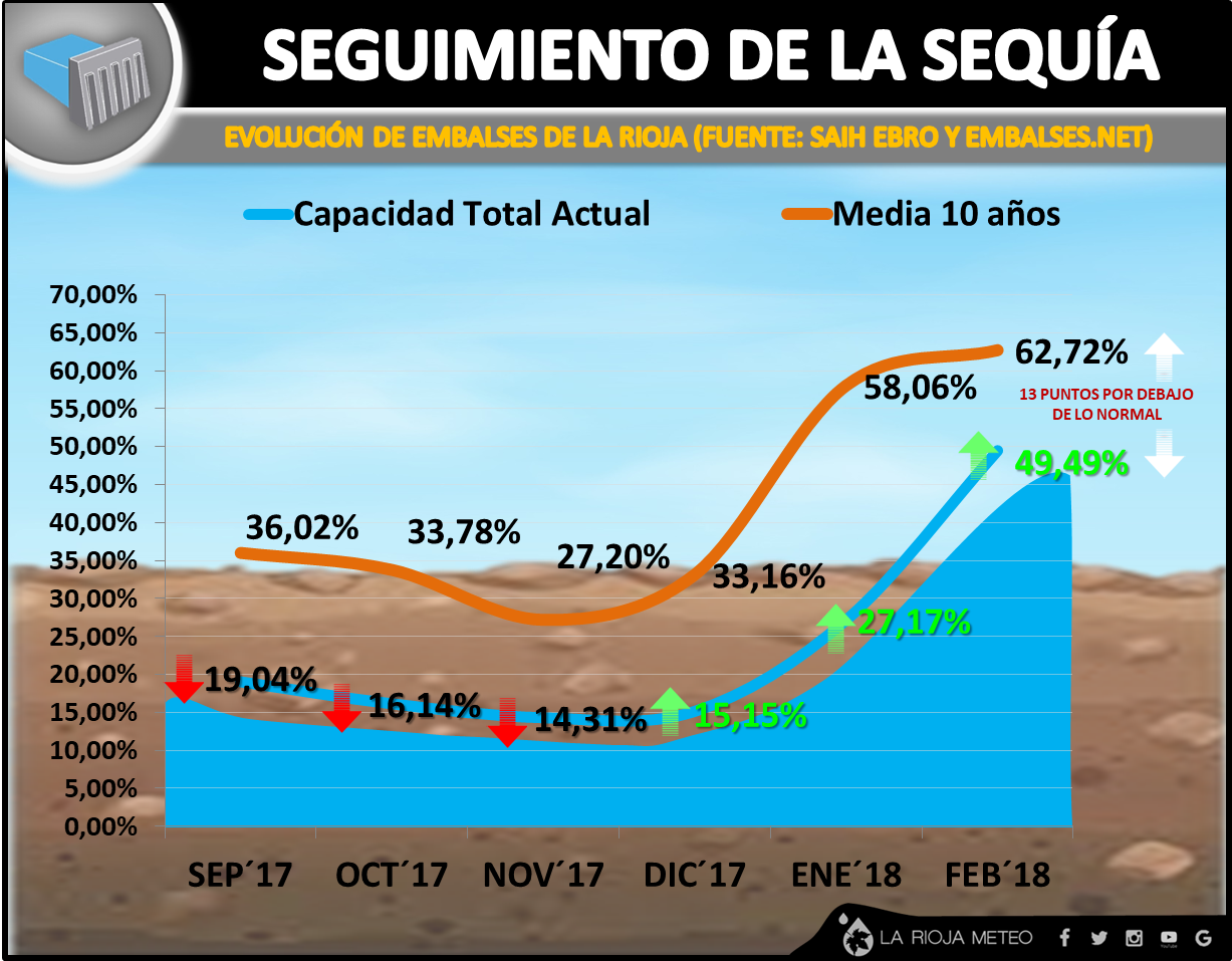Los importantes temporales de nieve y lluvia de los 2 últimos meses facilitan que la reserva hídrica en La Rioja triplique los valores que teníamos en diciembre (con algo más del 15% de agua embalsada respecto del total) hasta rozar el 50% de la capacidad total. Son datos que animan a pensar, que al menos en nuestra región, la sombra de la sequía se va alejado. Pese a ello, todavía nos encontramos en torno a 13 puntos porcentuales por debajo de las medias de los últimos años…no obstante hay que ser optimistas y todavía queda invierno por delante para subsanar esta situación.