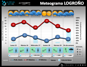 Estamos ante el inicio de un importante episodio de frío y nieve en La Rioja que se ha iniciado este jueves pero que podría extenderse durante toda la semana que viene….así que saquen bufandas, gorros, guantes y plumiferos porque viene fuerte! De momento nos quedamos con un inicio de viernes en el que las nevadas podrían aparecer en cotas por encima de 300/500 metros aunque no se espera que sean especialmente copiosas, excepto en la Ibérica. Los intervalos nubosos y los chubascos intermitentes serán la constante con unas temperaturas de pleno invierno. Continuaremos con una situación parecida durante el sábado, aunque la cota de nieve tenderá a subir de manera transitoria hasta los 600/800 metros, ya que el domingo volvería a caer al entorno de los 300/500 metros, aunque la jornada sería más tranquila. Por la tarde-noche algunos modelos estiman la llegada de nevadas desde el Este remontando el Ebro, pero unos modelos la ubican durante el domingo por la tarde-noche y otros la retrasan a la jornada del lunes….por lo que como decía al principio, este fin de semana más que nunca atentos a los posibles cambios en la predicción porque la incertidumbre en la localización de las nevadas va a ser bastante alta dado lo inestable de la masa de aire que nos va a afectar. Nos hacemos una idea con el meteograma de tendencia para la comarca de la ribera media:
