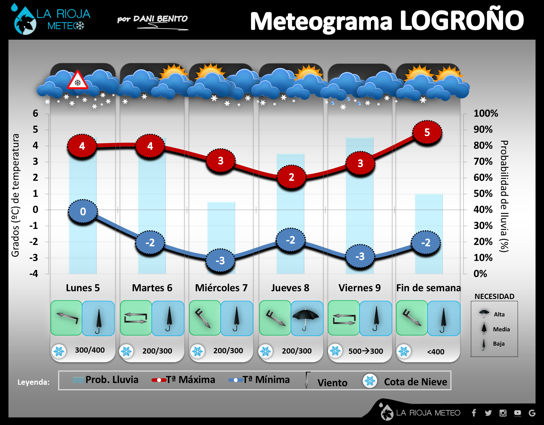 Estamos ante el inicio de una verdadera semana de invierno donde no faltará ni el frío ni la nieve en La Rioja. Podemos incluso decir que veremos nevar en cualquier municipio de La Rioja, incluida la ribera del Ebro, ya que la cota de nieve oscilará entre los 200/400 metros durante toda la semana, por lo que todo lo que caiga del cielo esta semana será nieve….aunque tampoco esperamos que vaya a nevar todos los días. Lo que si que será constante es el frío, con amplias y severas heladas y máximas que podrían quedar muy cortas, incluso por debajo de los 5ºC en el valle.