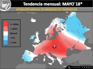 En general se esperan temperaturas más bajas de lo normal en todo el arco mediterráneo y países del sur de Europa. Esto se debe a las continuas descargas de aire frío que se van a ir sucediendo durante la primera quincena del mes que irían a parar al entorno de la Península de Grecia, Italia y zona de los Balcanes. Por extensión el resto del mediterráneo también podría verse afectado de manera más débil por esta anomalía negativa. Por el contrario, serán los países más septentrionales de la fachada Atlántica europea los que registrarán temperaturas superiores a las normales, como Sur de Noruega y Suecia, Dinamarca, Países Bajos, Gran Bretaña y norte de Francia, así como la mitad occidental de la Península Ibérica.