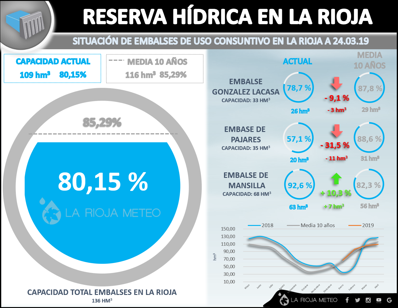 Tras las últimas lluvias en La Rioja la situación de los embalses ha ido mejorando ligeramente y la reserva hídrica ya alcanza el 80,15% de su capacidad total. Acumulamos ya hasta 109 hm3 de agua entre los 3 embalses de uso consuntivo: Mansilla, Pajares y González-LaCasa. Sin embargo existen algunos matices que merece la pena destacar.