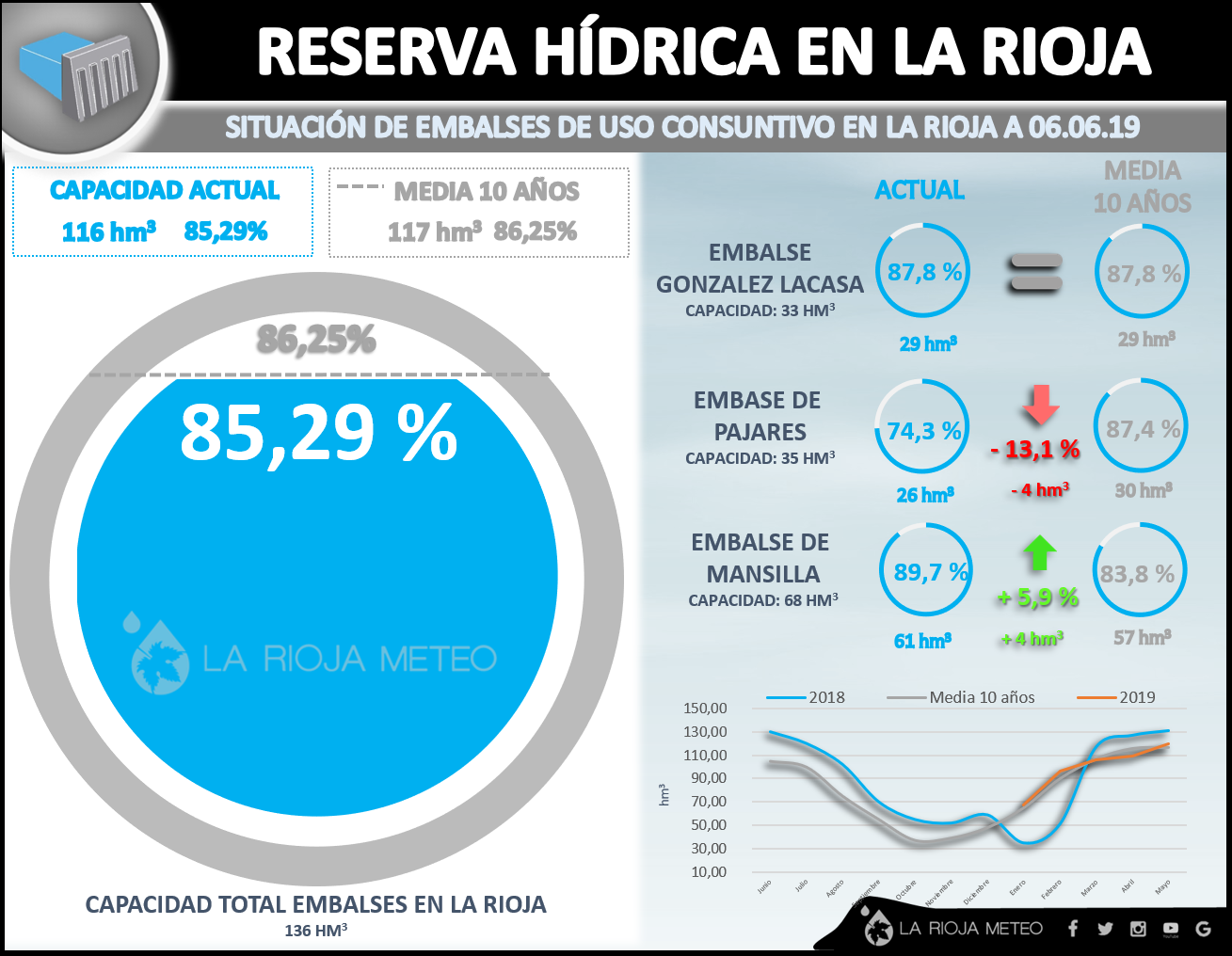 Tras un mayo bastante seco en La Rioja y pese haber sido frío en general, la situación de los embalses en La Rioja alcanza ya el 85% de su capacidad. Acumulamos ya hasta 116 hm3 de agua entre los 3 embalses de uso consuntivo: Mansilla, Pajares y González-LaCasa. Sin embargo existen algunos matices que cabe destacar: