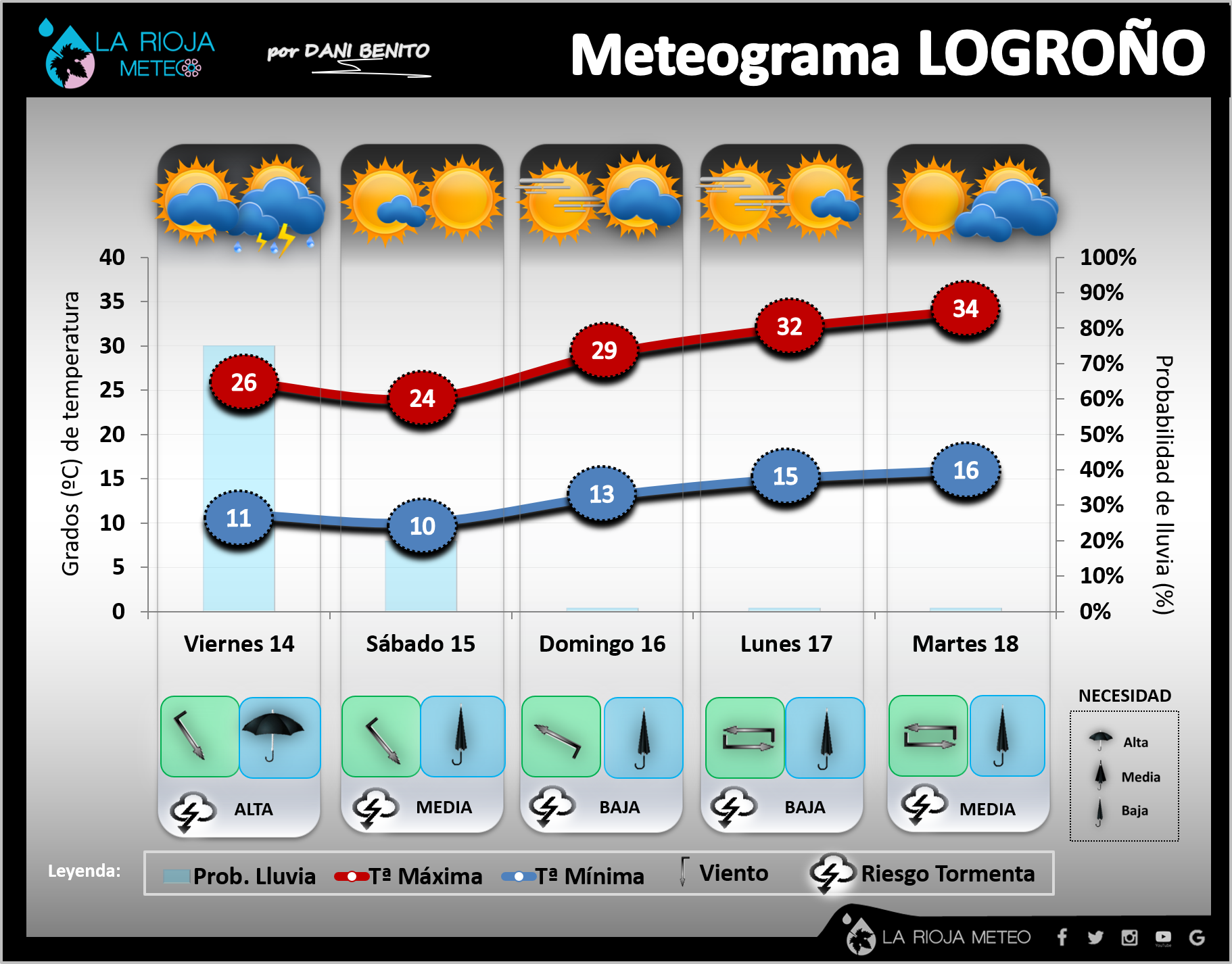 Los últimos coletazos de la bolsa de aire frío que se encuentran sobre la península traerán como consecuencia algunas tormentas durante el viernes y unas temperaturas más contenidas hasta el sábado. Si bien a partir del domingo la estabilidad y el calor comenzarán a ser los principales protagonistas. Nos hacemos una idea a través del meteograma de tendencia para Logroño y la comarca de la ribera media.