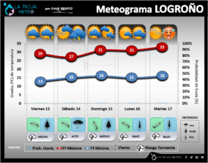 Cabe destacar que en nuestra comunidad pasaremos de tener claras anomalías positivas de temperaturas este jueves (hasta 10 ºC por encima de lo normal en Rioja baja) a importantes anomalías negativas para el viernes y fin de semana (hasta 10ºC por debajo de lo normal en áreas de la Ibéricas). Si lo traducimos en temperaturas máximas y mínimas, no sería raro que gran parte de la ribera quedara por debajo de los 20ºC de máxima (incluso por debajo de 15ºC en municipios de la Ibérica) y por debajo de los 10ºC de mínima (especialmente de cara al domingo y lunes) en la ribera, o rondando los 0/5ºC en municipios de la Ibérica.