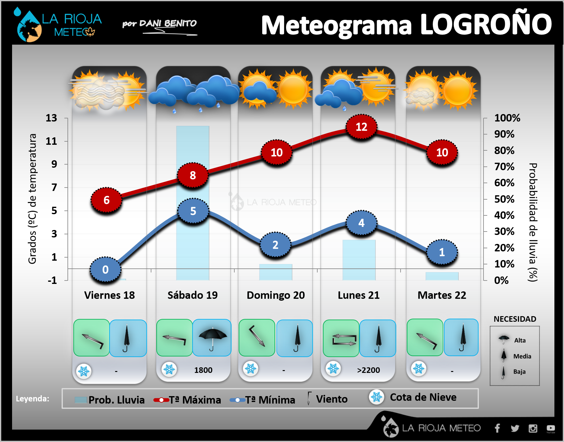 Tendremos un poco de todo. Las nieblas se harán dueñas de la meteo riojana de la ribera durante la jornada del viernes aunque tendiendo a levantar de manera progresiva, sólo de manera local podrían persistir en áreas de la ribera media (comarca de Logroño). Allí donde persitan las nieblas las temperaturas serán sensiblemente más bajas. En el resto tendremos tiempo agradable con algunas nubes altas sin consecuencias. Durante la jornada del sábado nos cruzará un frente frío, con precipitaciones débiles o localmente moderadas de distribución irregular, pues la orografia y la naturaleza estacionaria del frente las repartirán desigualmente. Además volverán a descender las temperaturas, especialmente donde el día anterior no teníamos nieblas (Ibérica y medianías) donde además podría nevar por encima de los 1700/1800 metros. Ya el domingo el tiempo tenderá a estabilizarse, aunque en la primera mitad del día todavía quedarán algunos intervalos nubosos aunque ya sin lluvia. De cara al lunes, de madrugada un nuevo frente volverá a dejar precipitaciones en la región, será cálido, por lo que las temperaturas comenzarán a recuperarse, a la espera de una nueva estabilización del tiempo de cara al martes.