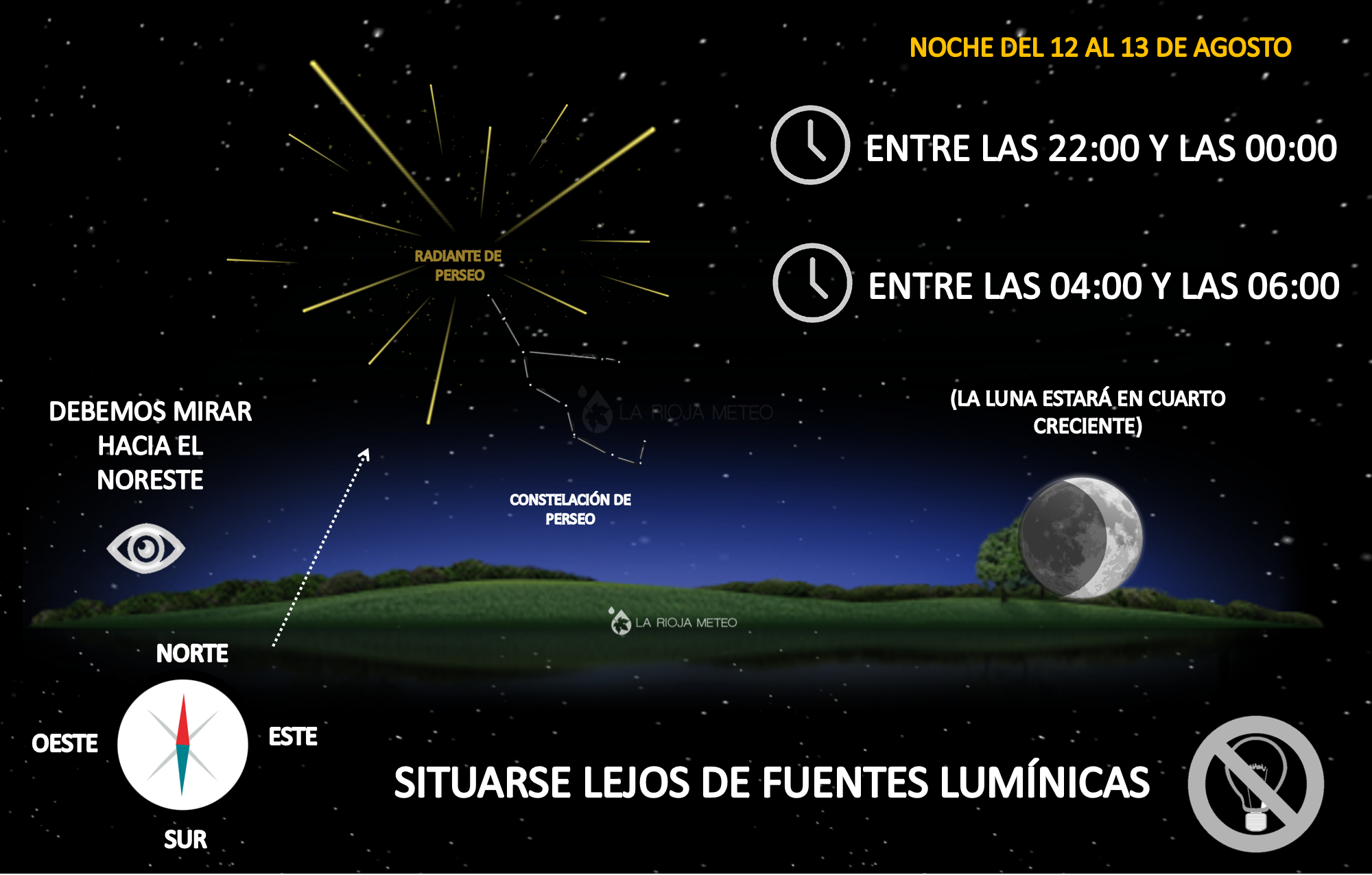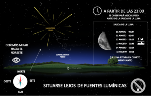 Así que en principio deberemos dirigir nuestra mirada hacia el Este/NorEste desde dónde surgirán, en mayor medida las estrellas fugaces. No obstante, también las podríamos ver en cualquier punto del firmamento, especialmente las más intensas, que podrán recorrer gran parte del horizonte nocturno. Es recomendable tumbarse en el suelo y dirigir los pies hacia el radiante de Perseo (Este-NorEste).