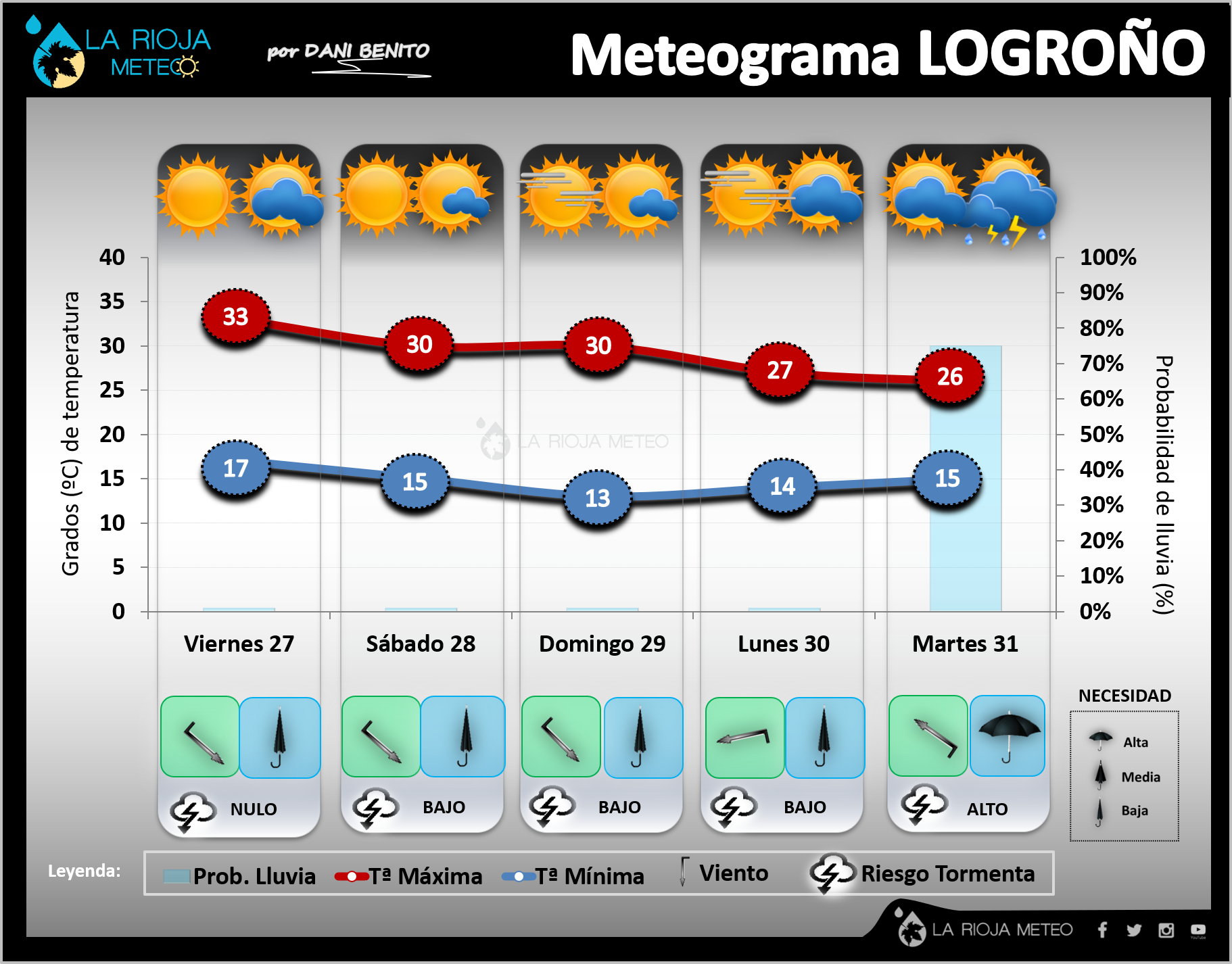 En La Rioja tendremos un fin de semana estable con temperaturas propias de la época, ya que las máximas oscilarán entre los 29/31ºC en la ribera y los 25ºC en municipios de la Ibérica, algo más altas durante el viernes hasta la entrada de Cierzo. Tendremos algunos intervalos de nubosidad media y alta durante el viernes y domingo, aunque no esperamos precipitaciones. El sábado probablemente será el día más despejado del fin de semana en la región, a excepción de algunas nubes de evolución que podrían crecer en la Ibérica, sin mayores consecuencias. Habrá que aprovechar este tiempo estable, porque todo indica que las tormentas podrían volver a partir del martes a la región.