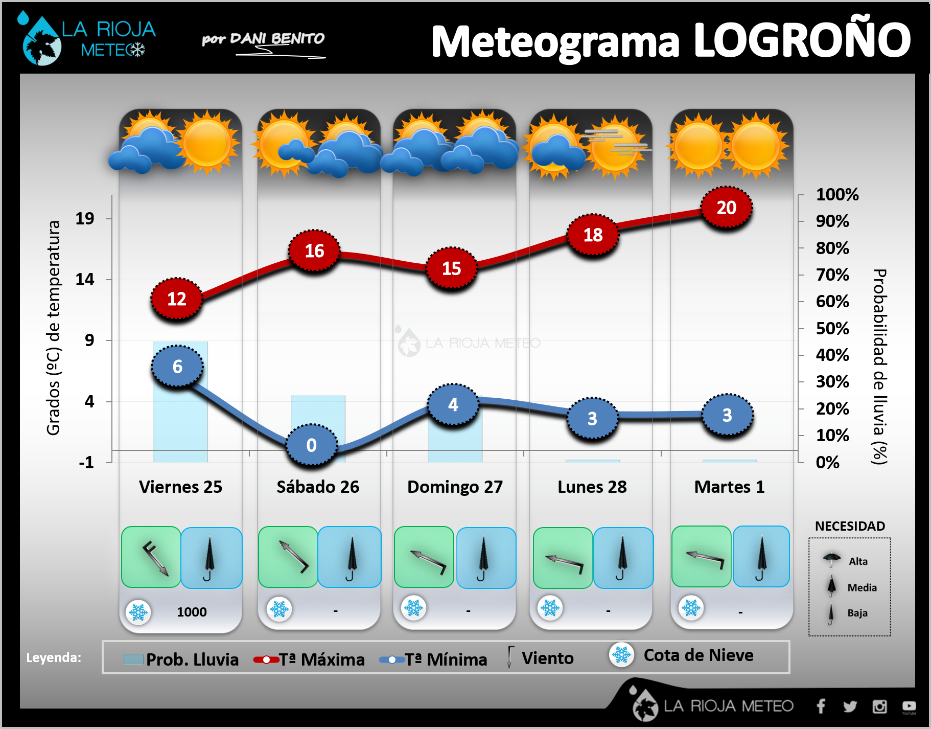 - Durante la primera mitad del viernes nos terminará de rebasar el raquítico frente frío, pudiendo dejar algunos chubascos débiles de madrugada en la Ibérica, que serán de nieve en el entorno de los 1000 metros. La nubosidad será abundante en la primera mitad, para después ir quedando más abierto, con intervalos de nubes medias y altas por la tarde. Será una jornada significativamente más fría que la anterior en lo diurno, mientras que las mínimas subirán por la cobertura nubosa y el Cierzo, que soplará con rachas moderadas. Ribera: 10/12ºC y 4/6ºC || Ibérica: 4/6ºC y -2/0ºC.