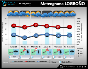 Las mayores y más intensas precipitaciones las esperamos entre la segunda mitad del jueves y primera mitad del viernes. Aunque como es habitual, los distintos modelos numéricos apuntan a cantidades diferentes, parece que convergen en señalar que rondarán los 40/50 litros en áreas de la Ibérica occidental (Demanda, Cebollera y Urbión) y los 20/30 litros en la Ibérica oriental (La Hez, Préjano y Alcarama). En lo que respecta a la ribera podríamos superar los 15 litros de manera generalizada, aunque todo apunta a que sólo se podrían llegar a superar los 25 litros en áreas de la ribera alta (comarca de Haro, Santo Domingo y Nájera).