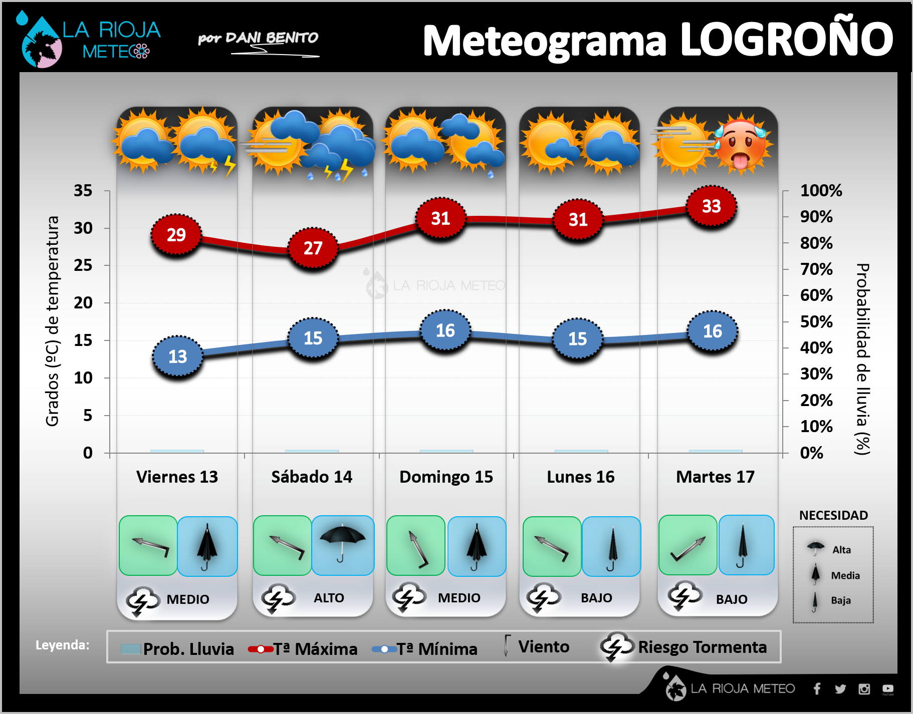 Calor y tormentas serán las protagonistas del fin de semana. Probablemente la jornada en la que el riesgo de tormentas sea menor sea precisamente este viernes, aunque con nubosidad baja por la mañana, alta en las horas centrales y de evolución por la tarde/noche, sin descartar algún chubasco débil y aislado a últimas horas. Por contra el sábado, aunque comience con cielos despejados, será muy difícil que libremos de ver tormentas en gran parte de nuestra geografía por la tarde, siendo el día que las veamos más generalizadas e intensas. El domingo de nuevo podríamos tener algo más de margen, con una mañana más tranquila y núcleos tormentosos que podrían aparecer por la tarde, pero serán más tardíos, locales y débiles. Las temperaturas subirán el viernes, podrán bajar ligeramente el sábado para volver a dispararse el domingo con la entrada de vientos del Sur (efecto foehn). No sólo las máximas van a rondar los 30ºC durante todo el fin de semana en la ribera o los 25ºC en la Ibérica, sino que las mínimas van a ser bastante veraniegas….con valores altos incluso en la medianoche.