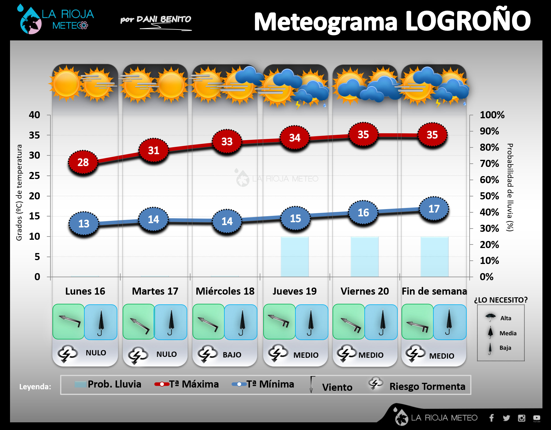 Sin duda vamos a vivir un adelanto del verano con todas sus consecuencias en La Rioja durante los próximos 7 días. El calor, asfixiante a días, será el verdadero protagonista de la meteo riojana. Sin embargo, la proximidad de esa vaguada planetaria que he comentado antes, provocará que los cielos no terminen de despejarse en la región con abundante nubosidad media y alta que velará e incluso cubrirá a días por completo los cielos. Esto se debe a la frontólisis de los sistemas atlánticos al encontrarse la barrera anticiclónica. Por si fuera poco, también tendremos algo de calima en la segunda mitad de semana. Los vientos en general serán flojos variables con predominio de la componente Este/SurEste en la ribera y del Sur en la Ibérica, algo más fuertes en esta última zona, especialmente de cara al jueves/viernes cuando tenderán a arreciar algo más en toda la región. Aunque no serán importantes, algunas tormentas podrían sorprendernos en la segunda mitad de la semana por la presencia de algo de aire frío en altura. Habrá que esperar al domingo 22 para ver una incipiente bajada térmica en la región….todavía no está clara la intensidad de este descenso y si vendrá acompañada de tormentas, por lo que os recomiendo que consultéis la predicción del fin de semana, que la publicaré a lo largo del jueves.