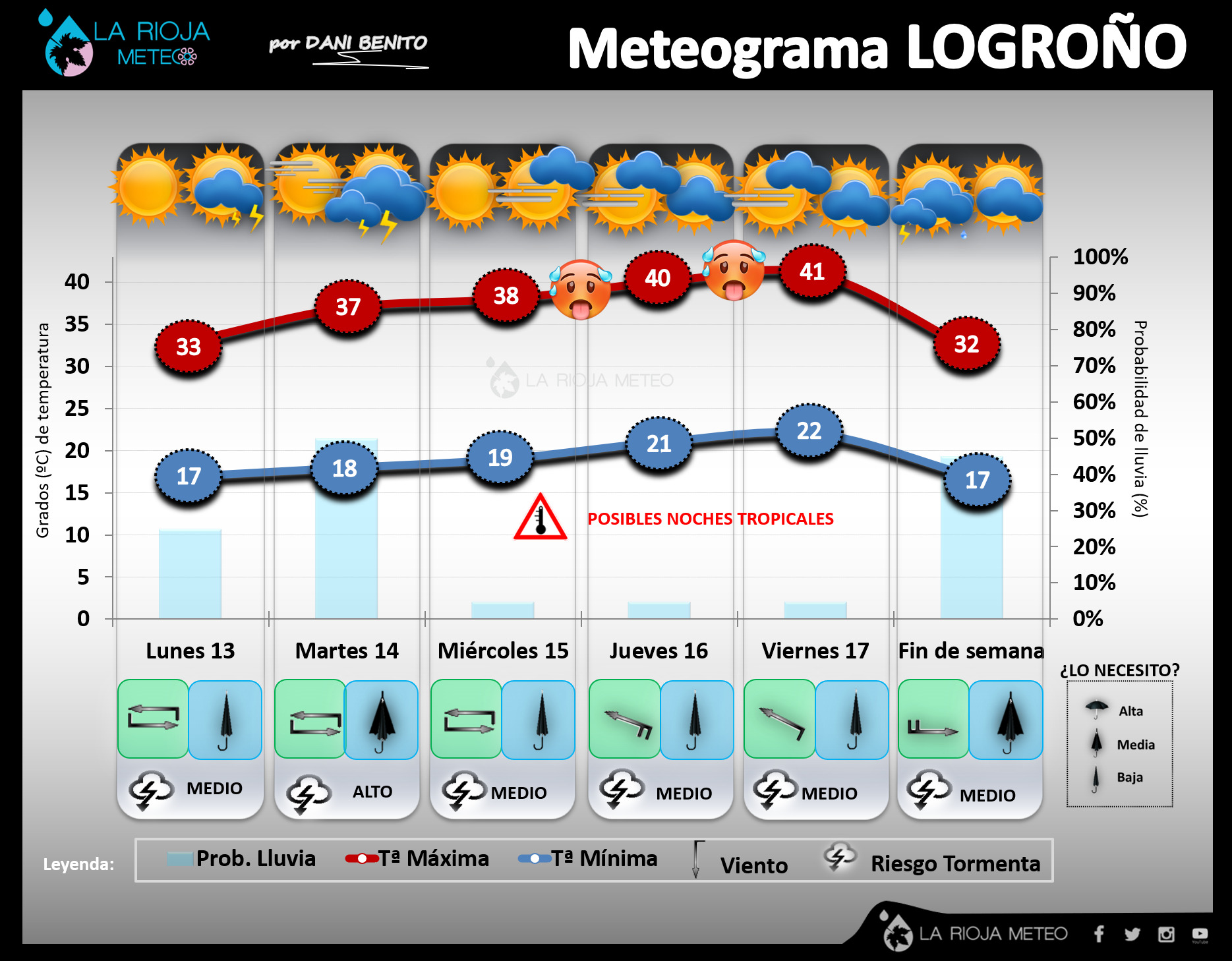 - Lunes que amanecerá con nubosidad de tipo bajo en las comarcas de Haro, Santo Domingo y Ezcaray, con tendencia a disiparse rápidamente. Ambiente calimoso con crecimiento de nubes de evolución a medida que avance el día, pudiendo dejar alguna tormenta aislada en áreas de la Ibérica. Los vientos flojos variables. Las temperaturas en ascenso ligero. Ribera: 32/34ºC y 16/18ºC ||| Ibérica: 26/28ºC y 12/14ºC.
