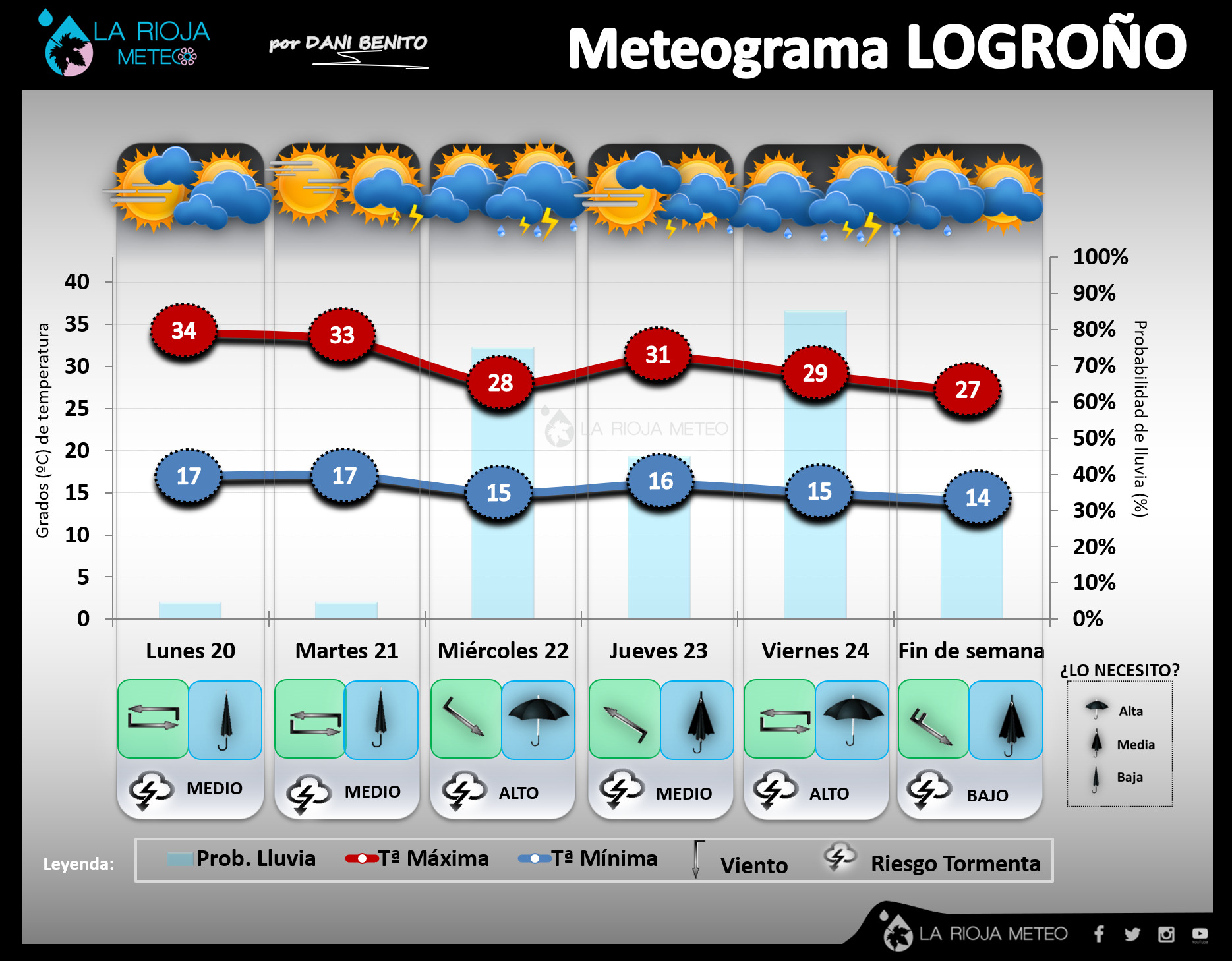 Semana de cambios en La Rioja y con fluctuaciones térmicas. Comenzaremos la semana con ambiente más cálido que el de este domingo aunque con nubosidad y riesgo de algunas tormentas, no serán gran cosa estos primeros días ya que la DANA se mantendrá bastante alejada. Será probablemente el miércoles cuando nos acerque uno de sus ramales e estabilice de manera sensible el tiempo en nuestra región con tormentas que podrían ser localmente fuertes ya que tendremos aire frío en nuestra vertical (-14/-17ºC a 5500 metros). Situación que en mayor o menor medida se prolongaría el jueves y viernes, con riesgo de tormentas de intensidad. Todo ello aderezado con un tobogán térmico, con bajada para el miércoles, subida para el jueves y nueva bajada para el viernes….manteniéndose probablemente durante el sábado y bajando aún más de cara al domingo por la entrada de flujo de norte. Además, durante el fin de semana estimamos nubosidad de tipo bajo impulsada por esos vientos del norte. Lo iremos viendo, ya que la incertidumbre todavía es alta.