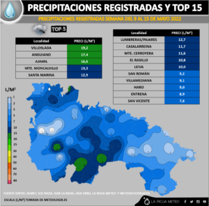 Los mayores acumulados se dieron el martes 14 en áreas de la Ibérica (El Rasillo, Mansilla y el alto Jubera con unos 5 litros de media). Durante el miércoles 15 las tormentas se canalizaron en mayor medida por el valle del Leza-Jubera, destacando los casi 8 litros que cayeron en la estación de Murillo de río Leza. El jueves 16 afectaron a áreas de la ribera oriental con entre 2/4 litros (Quel, 3; Alfaro, 2 y Ausejo 1 litro). El viernes 17 las líneas tormentosas afectaron más a la ribera alta, destacando los casi 7 litros de Santo Domingo de la Calzada o los 5 litros de Leiva. Durante esta jornada, de manera testimonial afectaron también a áreas de la ribera oriental y ribera navarra (Arnedo o Logroño con 1 litro; San Adrián con 1,5 litros). El sábado 18 apenas fueron perceptibles, rozando Enciso y el valle de Ocón con apenas 2,5 litros.
