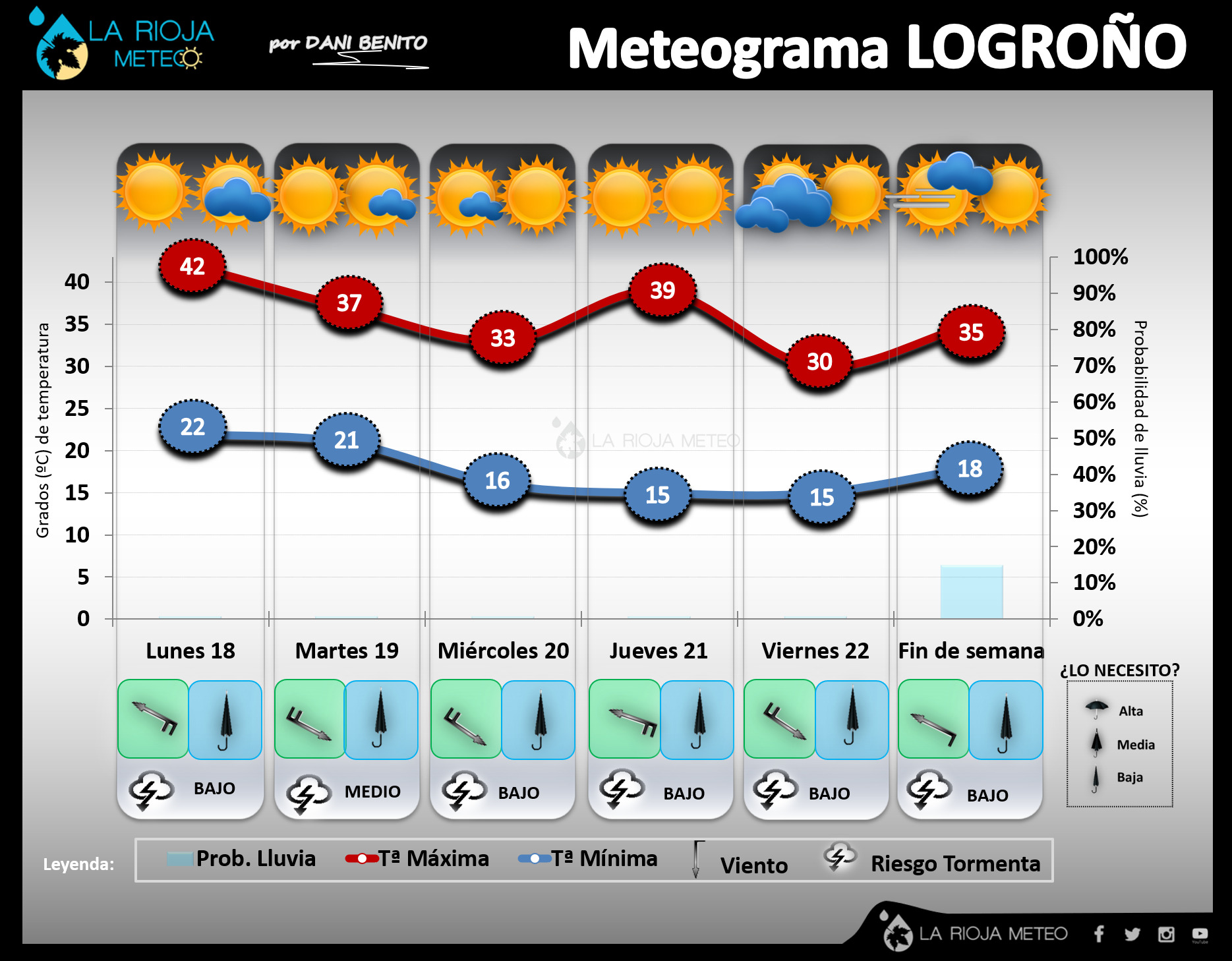 Tobogán térmico y ambiente seco, sería el resumen básico de esta tercera semana de Julio en La Rioja. Como comentaba en el contexto, todavía tendremos que sufrir un repunte térmico durante el lunes 18, tanto de máximas como de mínimas que podrían hacer caer algunos récords en la estación de Logroño-Agoncillo (42,8ºC de máxima el 7 de Julio de 1982; o 23,6ºC de mínima el 20 de Julio de 1995). Ya el martes las temperaturas comenzarán a bajar y alcanzaremos un ansiado respiro térmico en torno al miércoles con máximas por debajo de los 35ºC y con Cierzo…aunque que nadie espere pasar frio, seguiremos en valores estivales. El jueves probablemente volvamos a tener otro pico térmico aunque rondando valores de 37/38ºC en la ribera y de 34ºC en la Ibérica. Tras volver a sudar de manera transitoria, todo apunta a que un frente frío nos rozaría entre el viernes 22 y sábado 23, con flujo de norte y Cierzo, favoreciendo un marcado descenso térmico con nubosidad de retención en la mitad occidental e incluso riesgo de alguna llovizna débil. Este nuevo pequeño episodio nos traería más fresco que el anterior y las máximas podrían descender incluso por debajo de los 30ºC aunque la incertidumbre es tan grande que habrá que confirmarlo en próximas actualizaciones. Pese a que existe poca fiabilidad predictiva, los modelos nos indican un nuevo repunte térmico en la jornada del domingo 24…..lo iremos viendo.
