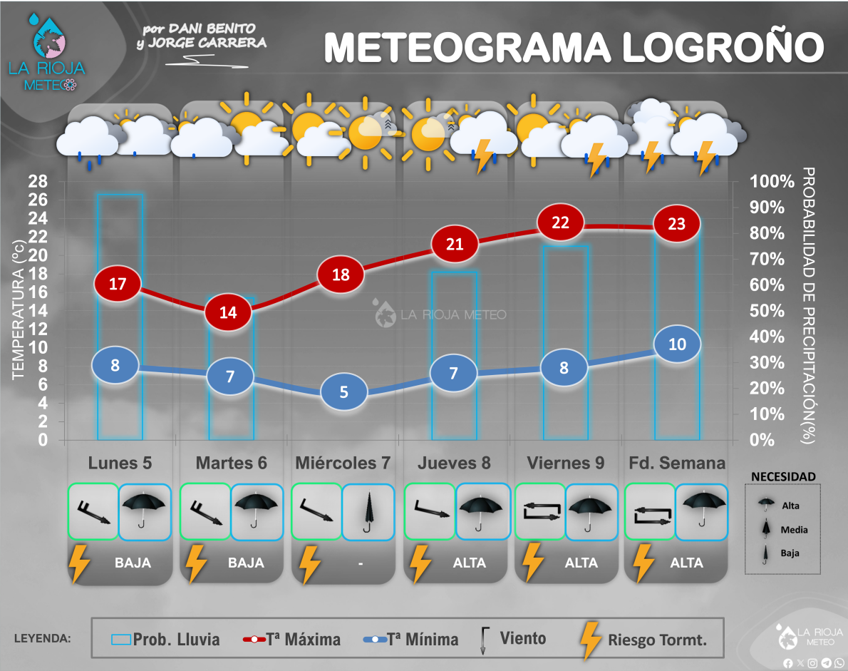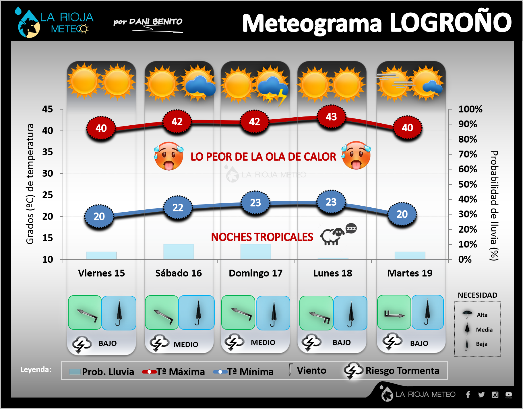 Hasta ahora nos hemos «cocido» de día con máximas que han rondando los 38/40ºC durante los últimos días, pero el ligero flujo de norte ha facilitado noches más llevaderas en La Rioja, con mínimas que sólo han sido tropicales en la ribera media y baja. Pero lo peor llegará durante los próximos 4 días a la región, con la rolada a SurEste (bochorno), con un paulatino ascenso de las máximas pero también de las mínimas. Es probable que no volvamos a bajar de mínimas de 20/22ºC hasta el martes (y a 18/19ºC). Las máximas tampoco se van a quedar atrás, y si bien el viernes se mantendrán estacionarias en torno a los 40ºC, el sábado, domingo y lunes volverán a subir siendo probables los 42/44ºC en áreas de la ribera y los 35/37ºC en municipios de la Ibérica. El pico térmico podría darse el lunes 18 de julio, y aunque la tendencia es a bajar a partir del martes….todo apunta a una bajada leve y probablemente transitoria, con repunte térmico en la segunda mitad de la semana próxima….lo iremos viendo. Respecto al estado del cielo, cielos poco nubosos de día y con nubosidad de evolución por la tarde, con riesgo de algunas tormentas secas (o reventones secos y cálidos), sobre todo en la Ibérica. La formación de masas nubosas derivadas de estas tormentas podrían actuar de manta térmica en las noches del sábado y domingo…por lo que las mínimas podrían dispararse aún más. No es para nada descartable que se superen récords térmicos en La Rioja. Tomando como referencia la estación de Logroño-Agoncillo, la estación con serie más larga de AEMET, el récord máximo data del 7 de Julio de 1982 con 42,8ºC; y el récord mínimo se sitúa en los 23,6ºC del 20 de Julio de 1995.