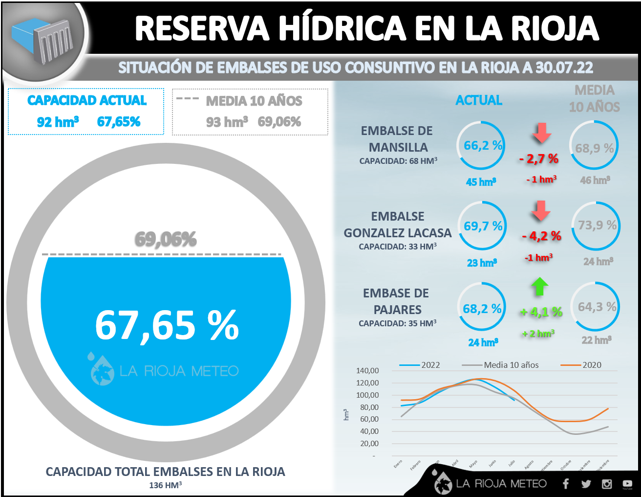 Con esta situación no es de extrañar que la demanda del consumo humano y vegetal en el último mes, con dos olas de calor en la espalda, haya esquilmado nuestros embalses alrededor de un 16% de media, perdiendo más de 20 hm3 de agua entre los 3 embalses de uso consuntivo de La Rioja. El embalse que más ha perdido proporcionalmente respecto a su capacidad es el de Pajares (-20%, casi 7 hm3 menos), aunque el que más agua ha perdido es el de Mansilla con 10 hm3 menos (-15%). González-LaCasa se ha dejado algo más de un 10% en el último mes, lo que representa alrededor de 4 hm3.