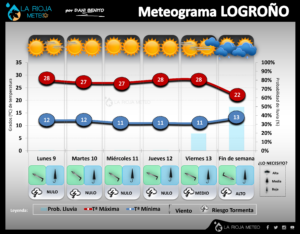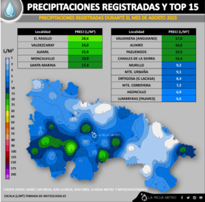 Desde luego que pluviométricamente este año está siendo un auténtico desbarajuste en La Rioja, con un clima que recuerda más a los periodos de monzones que a nuestro propio clima. Si rememoramos la pluviometría desde el inicio del año hidrológico (1 de Octubre), lo comenzamos con un octubre muy seco, con un noviembre «monzónico», un diciembre «relativamente húmedo» y un enero y febrero más secos que la mojama. Marzo y abril nos devolvieron gran parte de esa lluvia, pero de nuevo mal repartido….y de nuevo llegamos a un mayo, junio y julio en el que no ha caído ni gota, salvo las fuertes tormentas de «San Fermin» en Rioja baja.