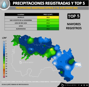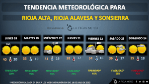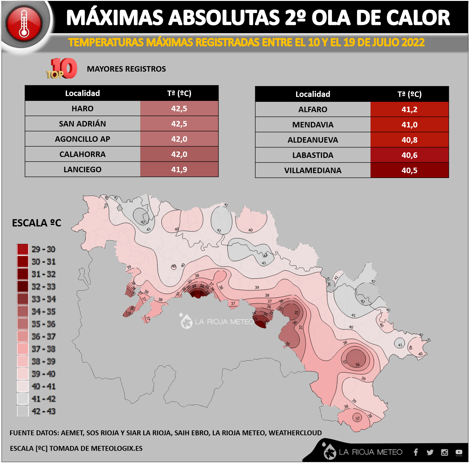 Durante la primera mitad de la semana pasada todavía tuvimos que soportar los estertores de la importante OLA DE CALOR, que nos llevó a hablar de máximas superiores a los 42ºC en puntos de la ribera del Ebro, destacando municipios de la DOCa como Calahorra, Peralta, San Adrián, Haro o Agoncillo y superando los 40ºC en gran parte de nuestra área de influencia. Podéis consultar todos los datos de esta ola de calor en este post.