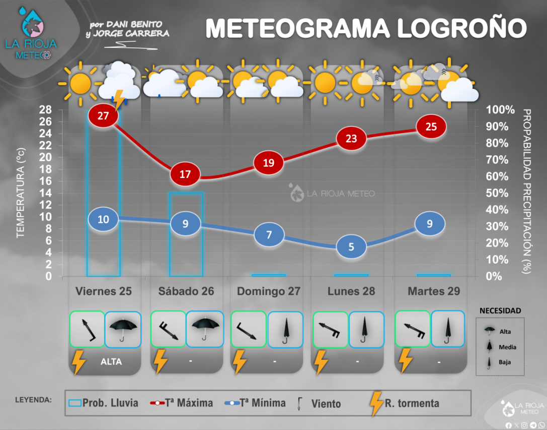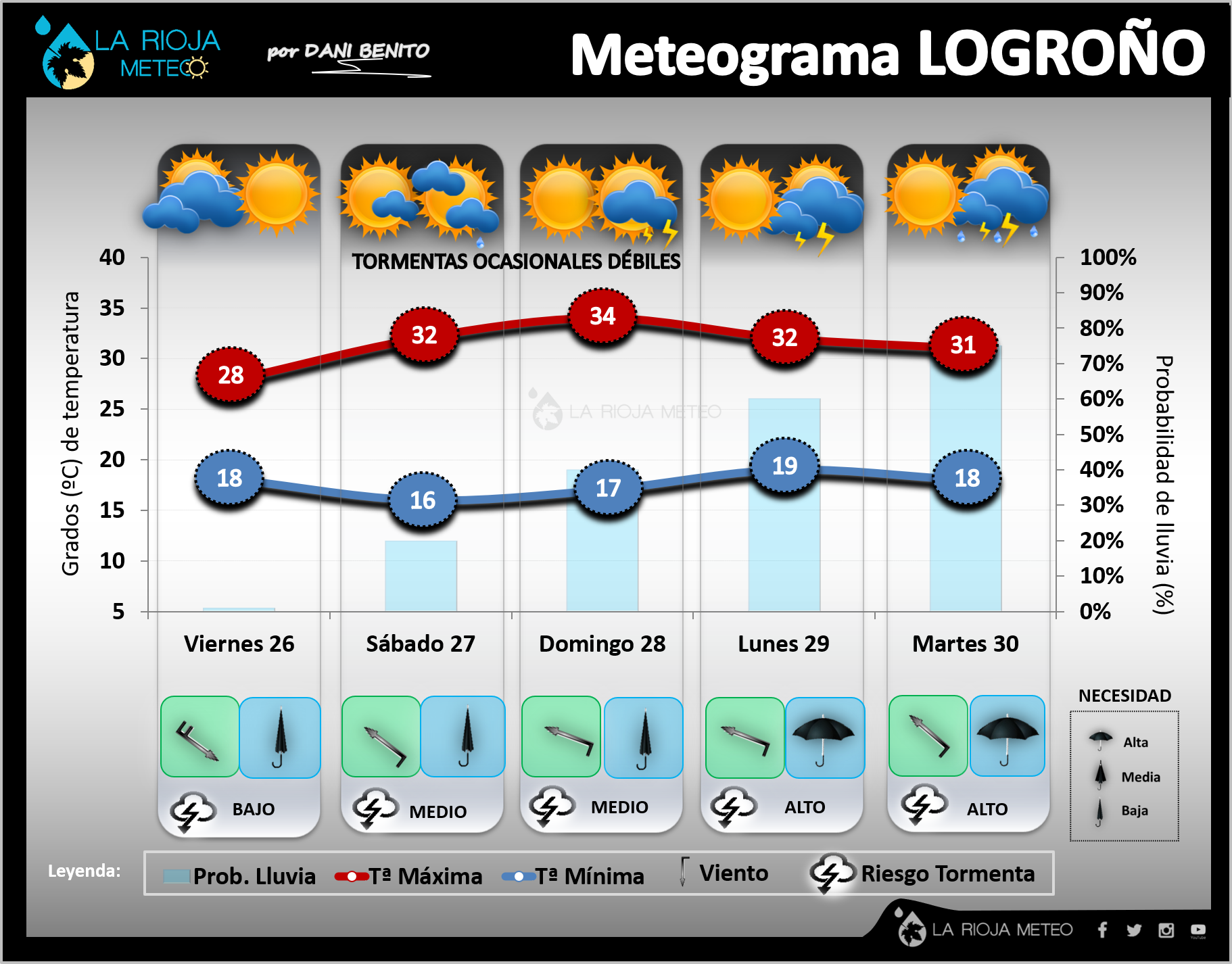 El Cierzo nos seguirá acompañando durante el viernes, modulando las temperaturas e inhibiendo las tormentas a pie de valle, con la típica nubosidad de retención en la mitad occidental, pero con escasas o nulas precipitaciones. Sin embargo, ya el sábado el flujo de norte será sustituido de manera progresiva por SurEste, lo que nos devolverá calor y bochorno a La Rioja, sobre todo el domingo. No son descartables algunos chubascos tormentosos tanto el sábado como el domingo, pero serán más probables en la Ibérica, siendo más ocasionales y aislados en el valle. Las temperaturas se dispararán durante el domingo y probablemente el lunes, a la espera de una posible nueva bolsa de aire frío que podría reactivar y generalizar las tormentas en la región. Las temperaturas podrían aguantar en valores veraniegos al menos hasta que acabe agosto. Lo iremos viendo.