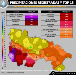 - La comarca de Cervera (cuenca del Alhama y Linares) con más de 30 litros, como Igea. Sin embargo la cabecera de comarca Cervera o Cabretón se quedaron entre los 10/20 litros.