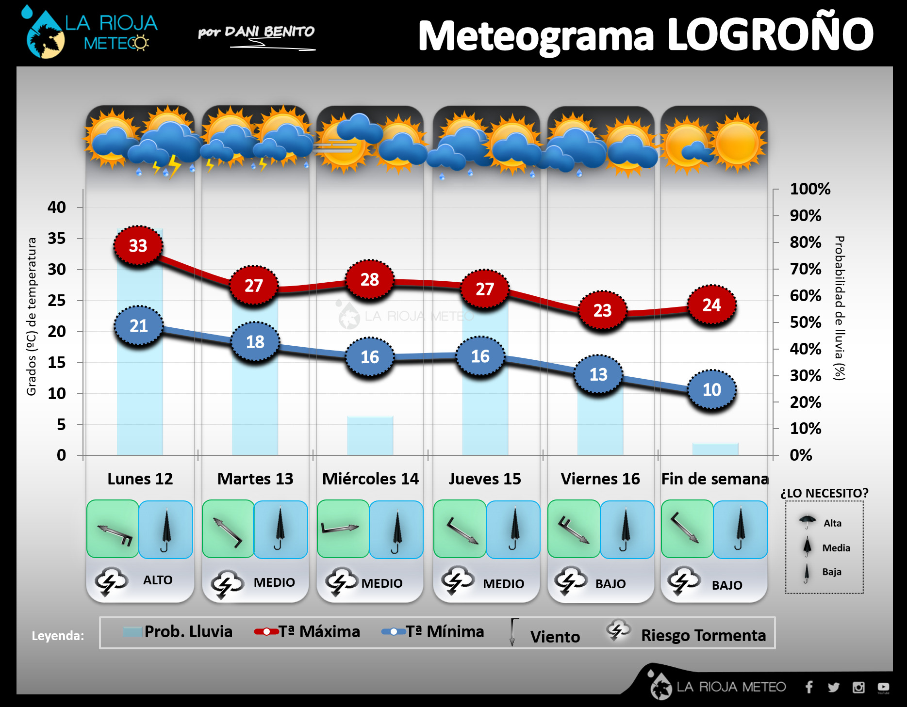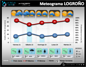 Probablemente el día en el que el bochorno sea más extremo sea este lunes, también será esta jornada una de las que más probabilidad de lluvia tendremos en su conjunto con tormentas localmente fuertes que podrían afectar a cualquier punto de la comunidad, aunque a priori serán más intensas en Rioja Media y Baja. Durante el martes quedaremos con una situación inestable, con probables chubascos tormentosos salpicados por toda la región, aunque de menor intensidad que el lunes, además notaremos un descenso notable de los termómetros. El miércoles será un día más estable, de transición, con menor riesgo de precipitaciones aunque sin descartarlas de manera más dispersa, con temperaturas que variarán poco o que incluso podrían subir algo en la ribera. Sin embargo la entrada de Cierzo de cara al jueves podría facilitar algunas lluvias «tranquilas» que afectarían en mayor medida a la mitad occidental de la región. Situación que tornará a «norte» durante el viernes, con abundante carga nubosa y un marcado descenso térmico, con precipitaciones débiles más probables en áreas montañosas orientadas al Norte. Por la tarde de esta jornada irá mejorando, así como el fin de semana, que probablemente encontraremos un tiempo más tranquilo, sin riesgo de lluvias pero con bastante fresco, sobre todo el sábado.