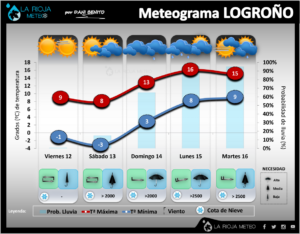 Tras un lunes y martes bastante anodinos, el miércoles comenzará a aumentar la nubosidad y ya a últimas horas podría comenzar a llover en las comarcas más suroccidentales de la región, especialmente en Urbión, cara sur de la Demanda y el alto Najerilla con las 7 villas como máximo exponente «llovedor» de la región con vientos del SurOeste. Las lluvias se harán persistentes durante toda la jornada del jueves y primera mitad del viernes en éste sector y se irán extendiendo a el entorno de Cebollera y en menor medida al resto de la Ibérica aunque con mucha menor cuantía hacia las sierras del Camero Viejo, Préjano, La Hez o Alcarama. Serán las últimas lluvias del año, ya que esperamos que el 31 sea seco y cálido, junto con Año Nuevo. Habrá que esperar al Lunes 2 de Enero para ver las primeras lluvias del 2023.