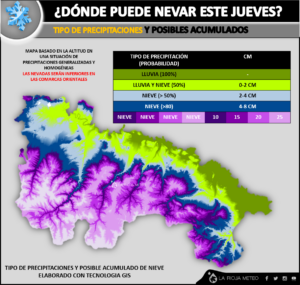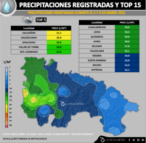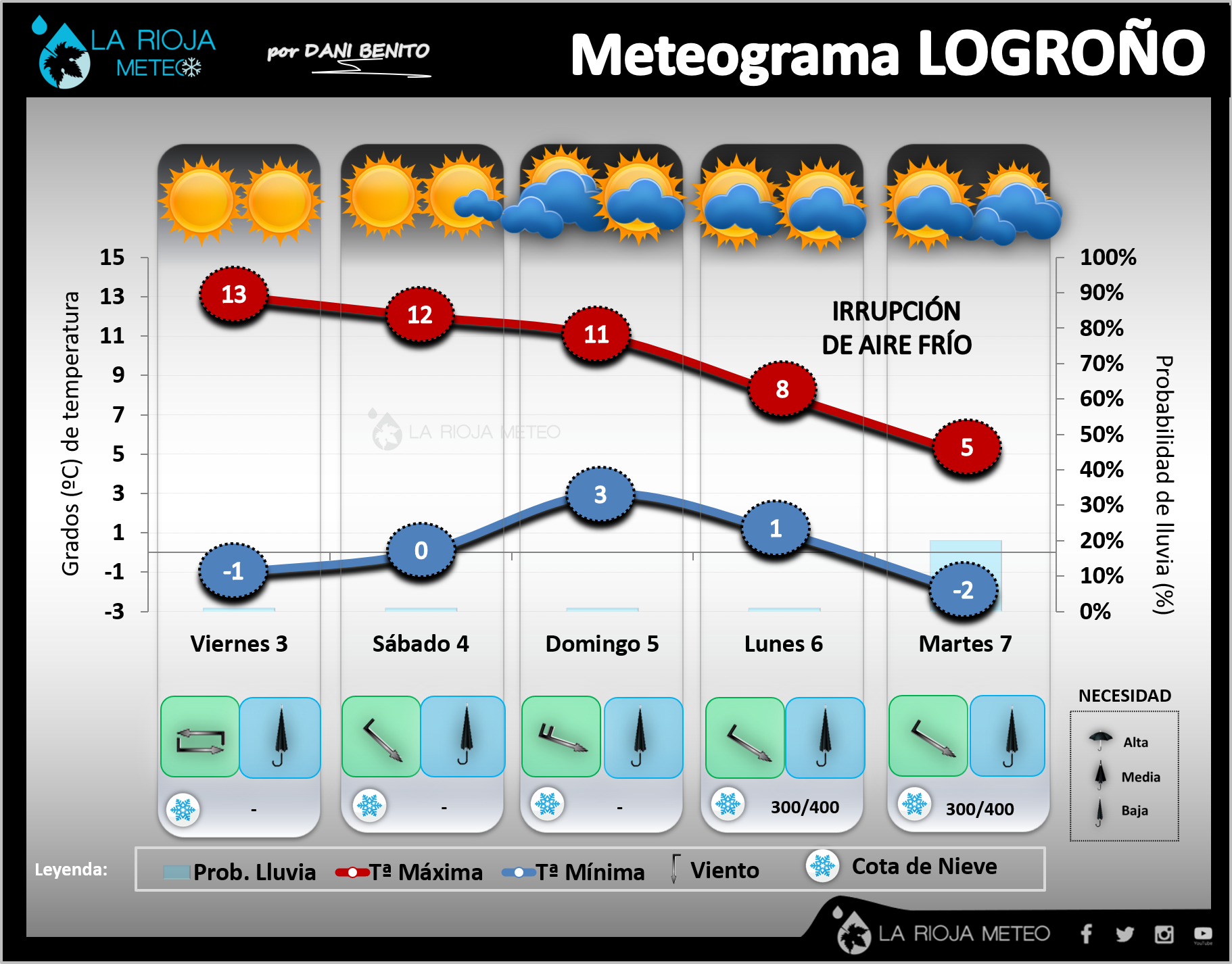 De momento en La Rioja nos centramos en este fin de semana, donde los cielos despejados serán protagonistas durante el viernes y sábado, lo que junto con las altas presiones reinantes y el afloje del Cierzo, favorecerán que estas noches sean frías en toda la región, con heladas moderadas en la Ibérica y débiles en el valle. Podría darse algo de inversión térmica de manera local (más calor en montaña que en el valle). Las máximas se dispararán y estos dos primeros días del finde podríamos alcanzar los 10/14ºC en áreas de la ribera y los 8/12ºC en áreas de la Ibérica. Sin embargo, de cara al domingo una mayor intensidad del flujo de norte, nos acercará desde el cantábrico estratos de nubosidad baja a la región, que junto con un aumento de la velocidad del viento inhibirá en cierto grado las heladas en la comunidad, aunque se seguirán produciendo, sobre todo en la Ibérica. Por el contrario, la nubosidad durante esta jornada reducirá las máximas en toda la comunidad, persistiendo las nubes más tiempo en las comarcas montañosas de la Ibérica occidental (comarca de Ezcaray, Anguiano y Camero Nuevo) y en áreas de la ribera alta (comarcas de Haro, Santo Domingo y Nájera, especialmente). No se esperan precipitaciones en todo el fin de semana.
