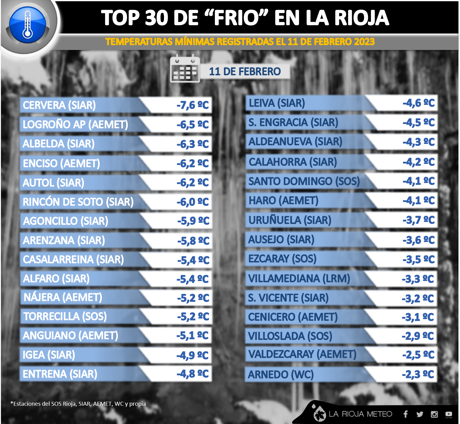 Sin duda la comarca de Cervera se ha congelado estas últimas noches con registros entre los -8/-5ºC. Sorprende también los bajos valores de la estación de Logroño-Agoncillo (Aeropuerto) de AEMET con unos gélidos -6,5ºC…sin embargo lejos de la mínima absoluta para un mes de febrero que todavía ostenta el 11 de febrero de 1956 con -9,5ºC.