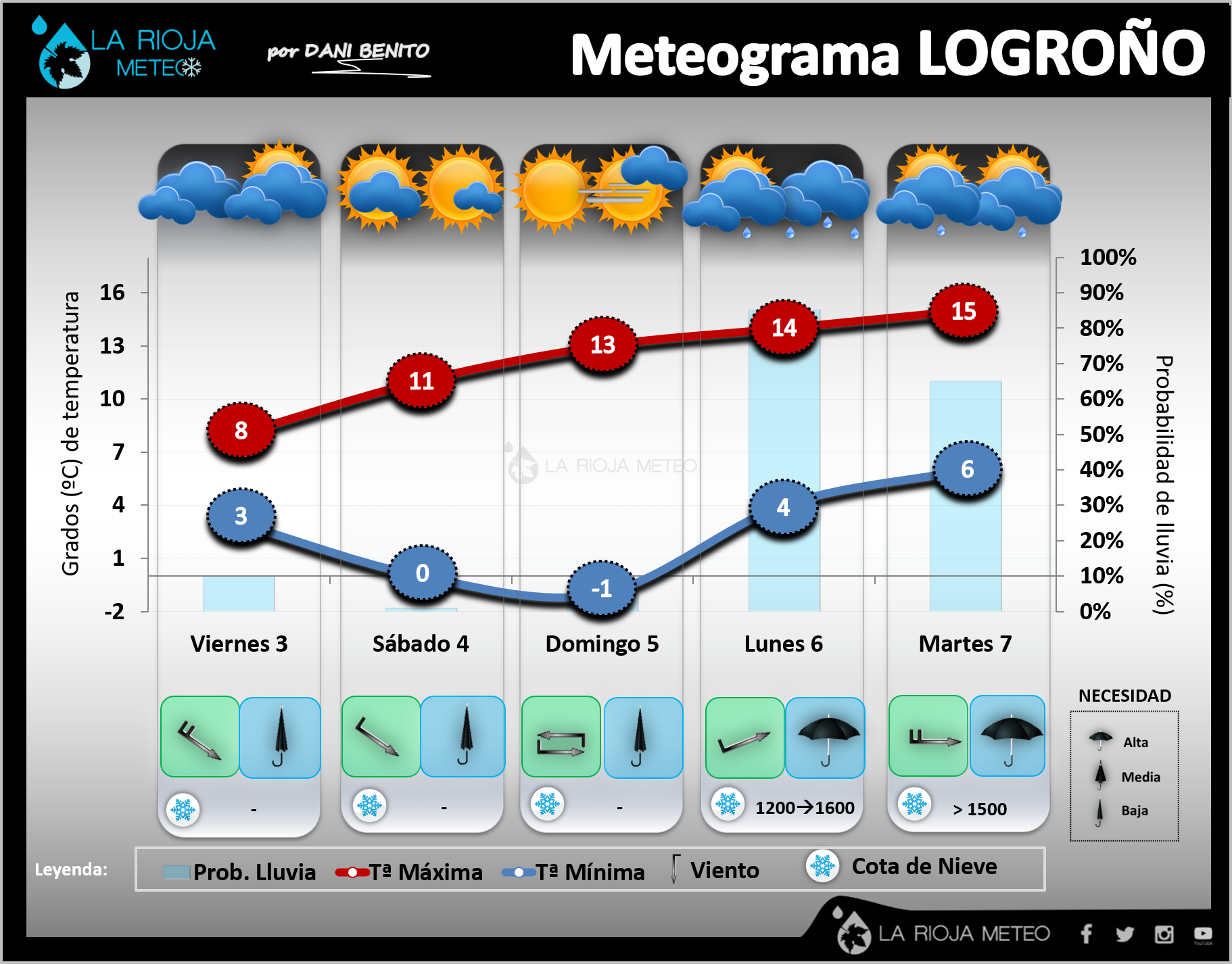 - VIERNES 3 DE MARZO: todavía tendremos un viernes marcado por la nubosidad abundante de retención por la influencia de los vientos del norte, que además podrían dejar algunas precipitaciones débiles en áreas de la Demanda, Cebollera, Moncalvillo y Los Cameros. Serán precipitaciones débiles que apenas dejarán 3/4 litros, en el mejor de los casos, pero que lo harán en forma de nieve por encima de los 700/800 metros. No se descartan algunos chubascos débiles dispersos y ocasionales en la ribera alta y media. El Cierzo seguirá dejándose notar en la ribera baja y comarcas de Cervera y Alfaro, con rachas de 50/60 km/h en las horas centrales del día, aunque irá poco a poco a menos hacia la noche. No obstante, acrecentará una sensación térmica invernal. En el resto vientos del NorOeste moderados (30 km/h). Las temperaturas máximas permanecerán con pocos cambios, mientras que las mínimas subirán, acusando ya la retirada de la masa de aire frío continental que nos ha venido. Ribera: 7/9ºC y 2/4ºC || Ibérica: 2/4ºC y -3/-1ºC.
