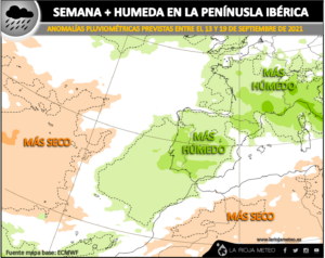 Como consecuencia de la configuración meteorológica prevista, una semana más tendremos anomalías térmicas positivas en gran parte del país, sin embargo esta semana las mayores quedarán restringidas a áreas de la mitad sur gracias al «empuje» de esos frentes. Frentes que, por otro lado, sólo favorecerán que se registren superávits pluviométricos en puntos del litoral cantábrico y Gallego.