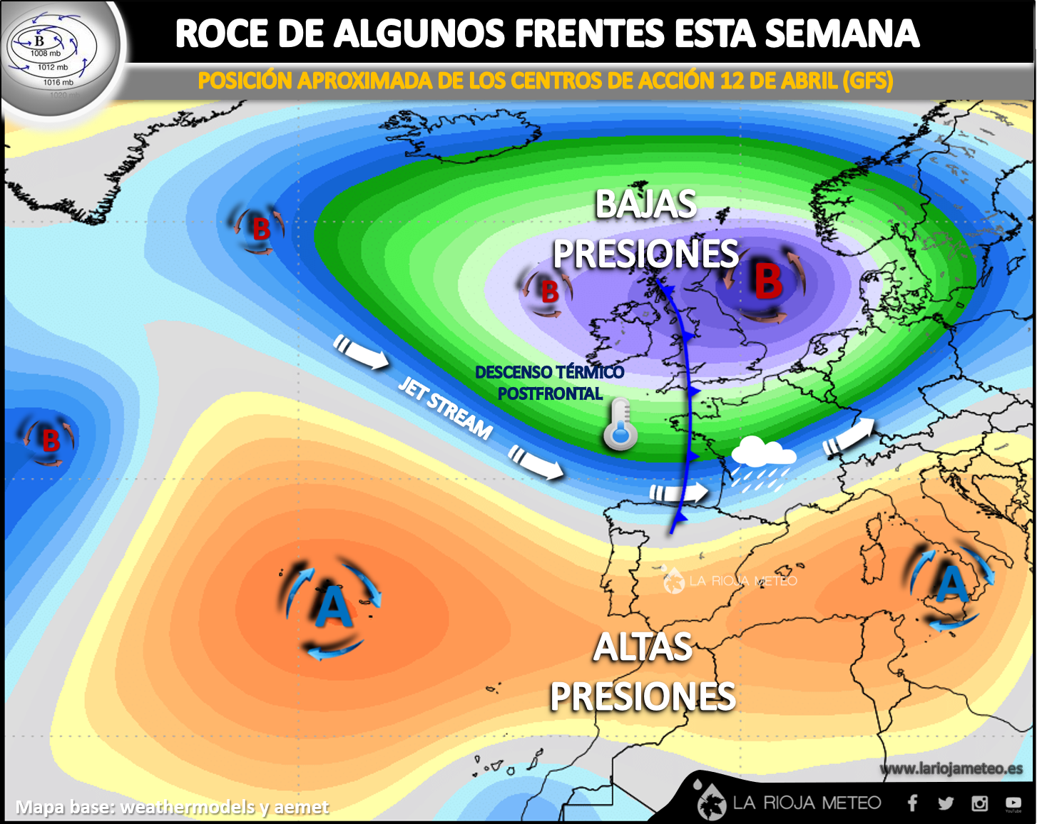 El debilitamiento del anticiclón y la retirada de la dorsal que lo sustenta hacia el sur, permitirá que durante esta semana algunos frentes sean capaces de atravesar de manera efectiva el tercio norte del país. Asociado a este paso de frentes tendremos un descenso térmico significativo que notaremos con mayor entidad durante el jueves 13, con unas temperaturas que bajarán de manera evidente tras el paso del frente frío del miércoles 12 de abril. Posteriormente quedaremos con una situación más fresca, con el roce de frentes que aportarán como mínimo nubosidad a la mitad norte del país, aunque con lluvias sólo circunscritas al extremo norte, en los litorales de las comunidades del cantábrico….y es que el anticiclón irá metiendo el morro de nuevo sobre la Península Ibérica de manera progresiva en la segunda mitad de la semana.