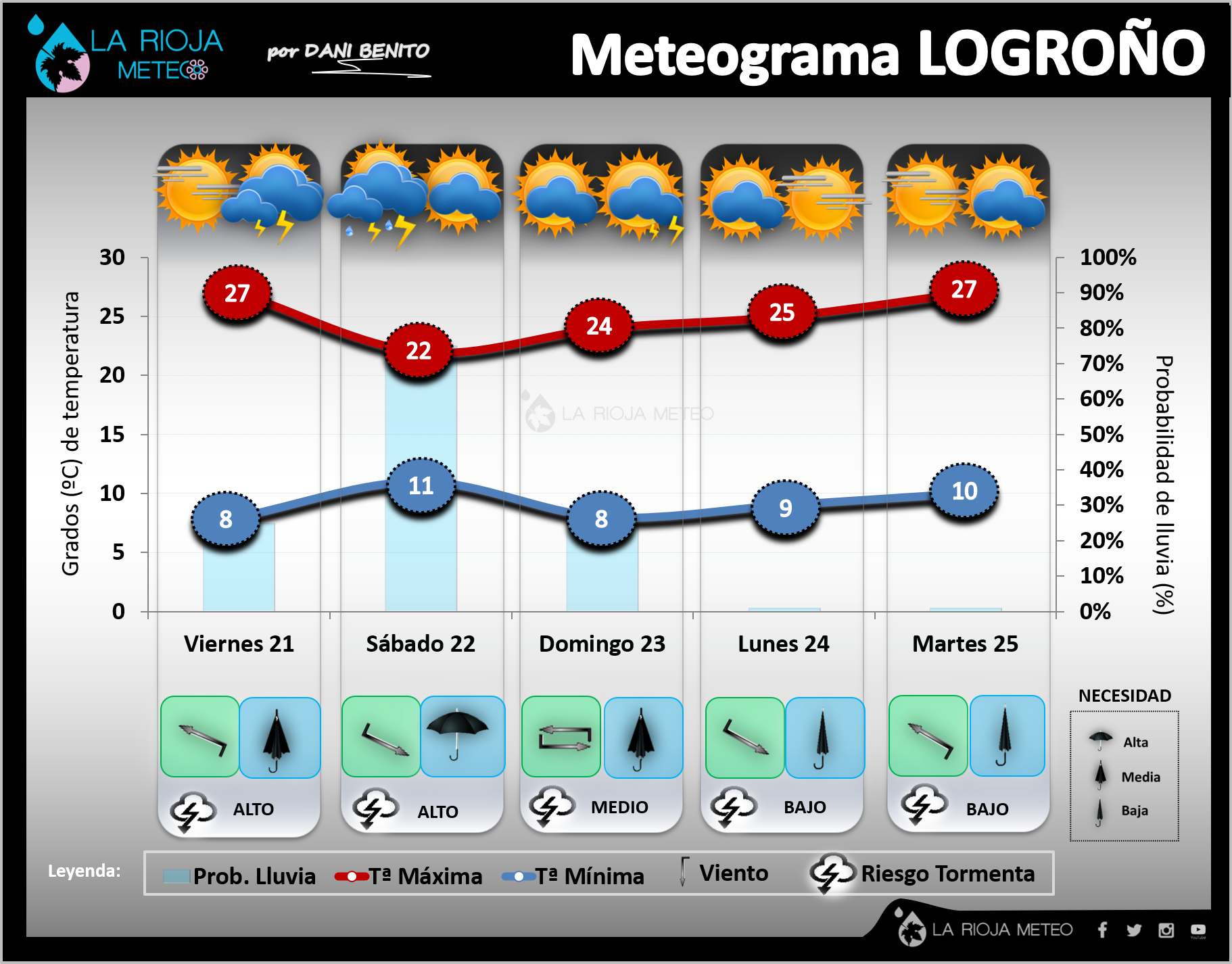 En lo que respecta a las temperaturas, se mantedrán muy altas durante el viernes con los modelos automáticos dándonos entre 27/29ºC en puntos de la ribera. Sin embargo la abundante nubosidad que tendremos a partir de la tarde tenderá a frenar este ascenso y quedarán en torno a los 25ºC aproximadamente, aunque la sensación de bochorno será como en verano. El sábado bajarán las temperaturas al paso del frente frío durante la madrugada, sin embargo quedaremos con máximas próximas a los 22/24ºC en la ribera y los 16/18ºC en la Ibérica. El domingo, aunque dependerá de lo que termine penetrando ese frente cálido con gran incertidumbre, las temperaturas máximas volverán a subir uno o dos grados, hasta los 23/25ºC en la ribera y los 17/19ºC en la Ibérica, algo más cortas si el frente terminará por afectarnos de manera más efectiva. Las mínimas por su parte, rondando los 7/9ºC el viernes y domingo, y los 10/12ºC durante el sábado en la ribera. En la Ibérica rondarán los 5/7ºC durante todo el fin de semana. Para inicios de semana se volverá a iniciar un marcado ascenso térmico, aunque sin lluvia a la vista. Vamos a ver el tiempo significativo que podríamos encontrar en el entorno de Logroño y la comarca de la ribera media.