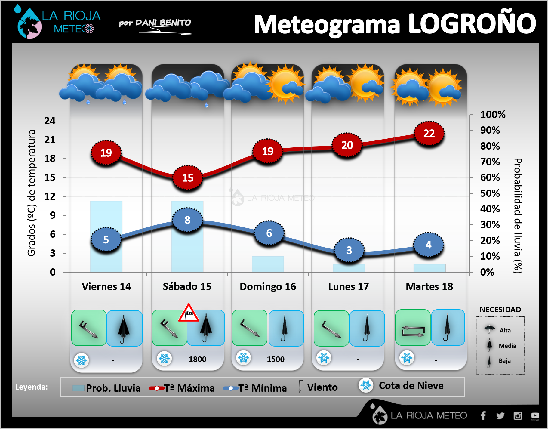 Tendremos un fin de semana con situación de nortes en La Rioja. Nubosidad abundante arrastrada por los vientos del norte, que soplarán con fuerza tanto en el valle como en la montaña (días de Cierzo por delante). Aunque no se esperan precipitaciones significativas, si que podríamos tener algún chubasco en la tarde del viernes asociado al paso de un último frente y también podría llovisquear durante el sábado por la estratada (nubes bajas) cantábrica que cubrirá la región. El domingo tenderán a abrirse más claros, con un ascenso de las temperaturas. Vamos a verlo por días: