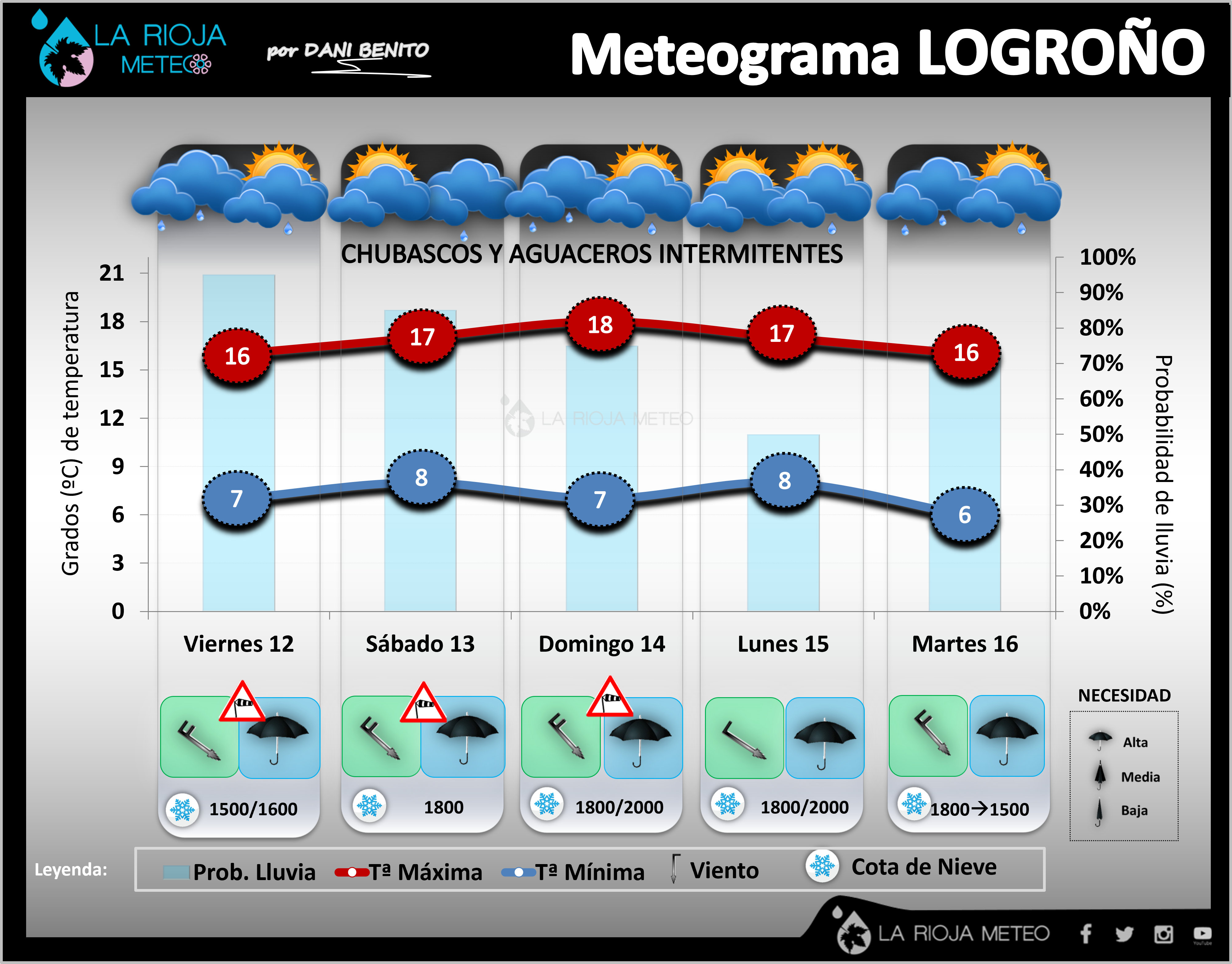 - VIERNES 12 DE MAYO. Cielos muy nubosos durante toda la jornada con riesgo de chubascos y aguaceros en cualquier punto de la región, aunque más frecuentes e intensos en las horas centrales del día y en las comarcas occidentales de la comunidad. Podrían tener carácter tormentoso La cota de nieve podría rondar los 1500/1600 metros. El intenso Cierzo abrirá algunos claros transitorios, sobre todo en la mitad oriental. Las temperaturas tocarán fondo. Ribera: 15/17ºC y 7/9ºC || Ibérica: 9/11ºC y 1/3ºC.