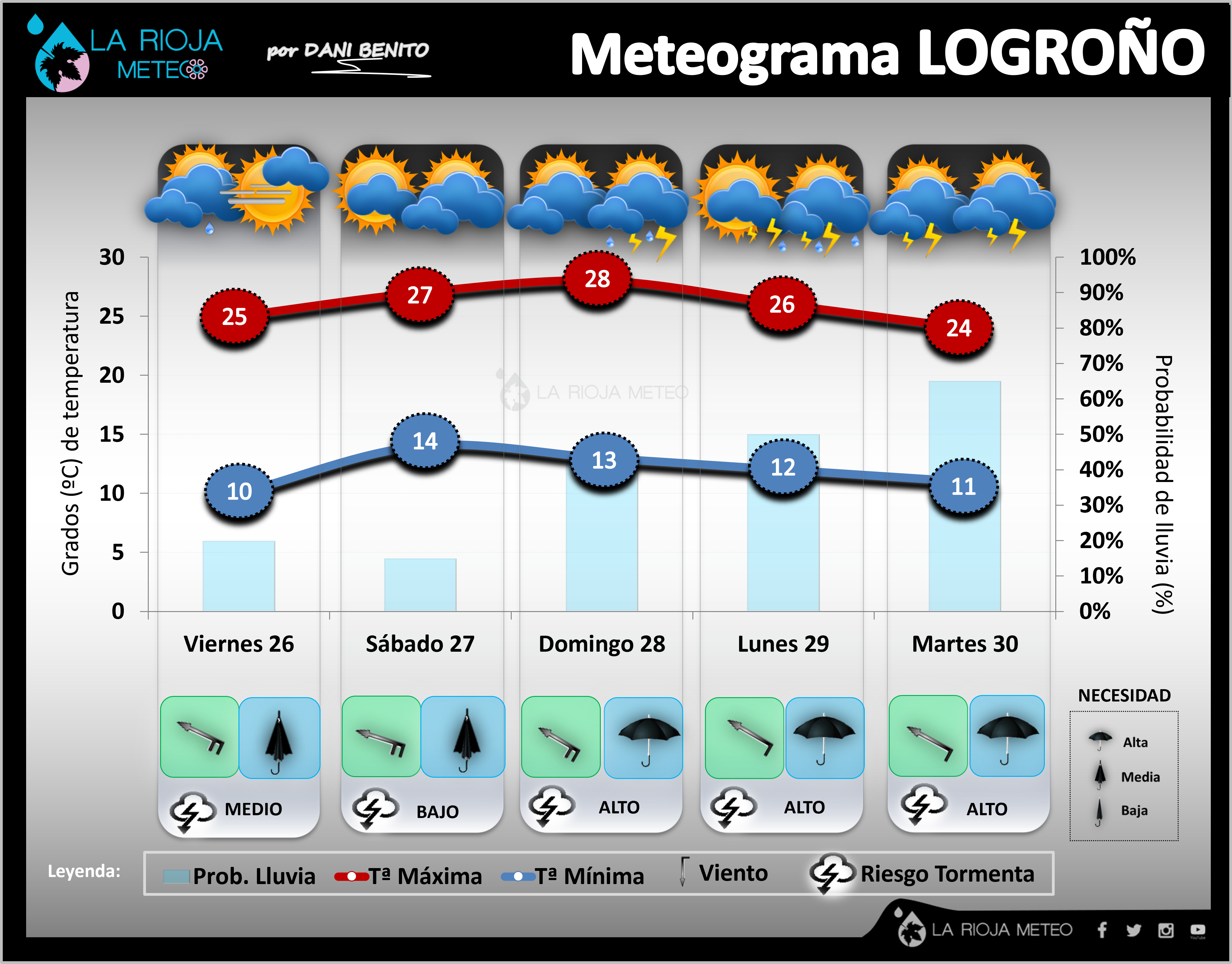 Tras la entrada de flujo de norte durante la tarde del jueves, que hemos sentido en forma de bajón térmico y algunas gotas, el giro de la DANA, ya en trayectoria hacia Portugal, nos inyectará desde primera hora del VIERNES viento del SurEste bastante intenso. Esta condición cambiará de manera evidente el tiempo en la comunidad, acercando en la primera mitad algunas precipitaciones que retomarán el ebro, poca cosa, pero podrán caer de manera dispersa y débil. Por la tarde, se formarán algunos cúmulos tormentosos que de manera ocasional podría afectar a las comarcas de la Ibérica (con mayor probabilidad a la oriental), con poca probabilidad de que evolucionen hacia la ribera. Las temperaturas máximas subirán de manera evidente, sobre todo en Rioja Alta, donde el jueves bajaron más. Las mínimas en descenso. Ribera: 22/24ºC y 9/11ºC || Ibérica: 17/19ºC y 5/7ºC.
