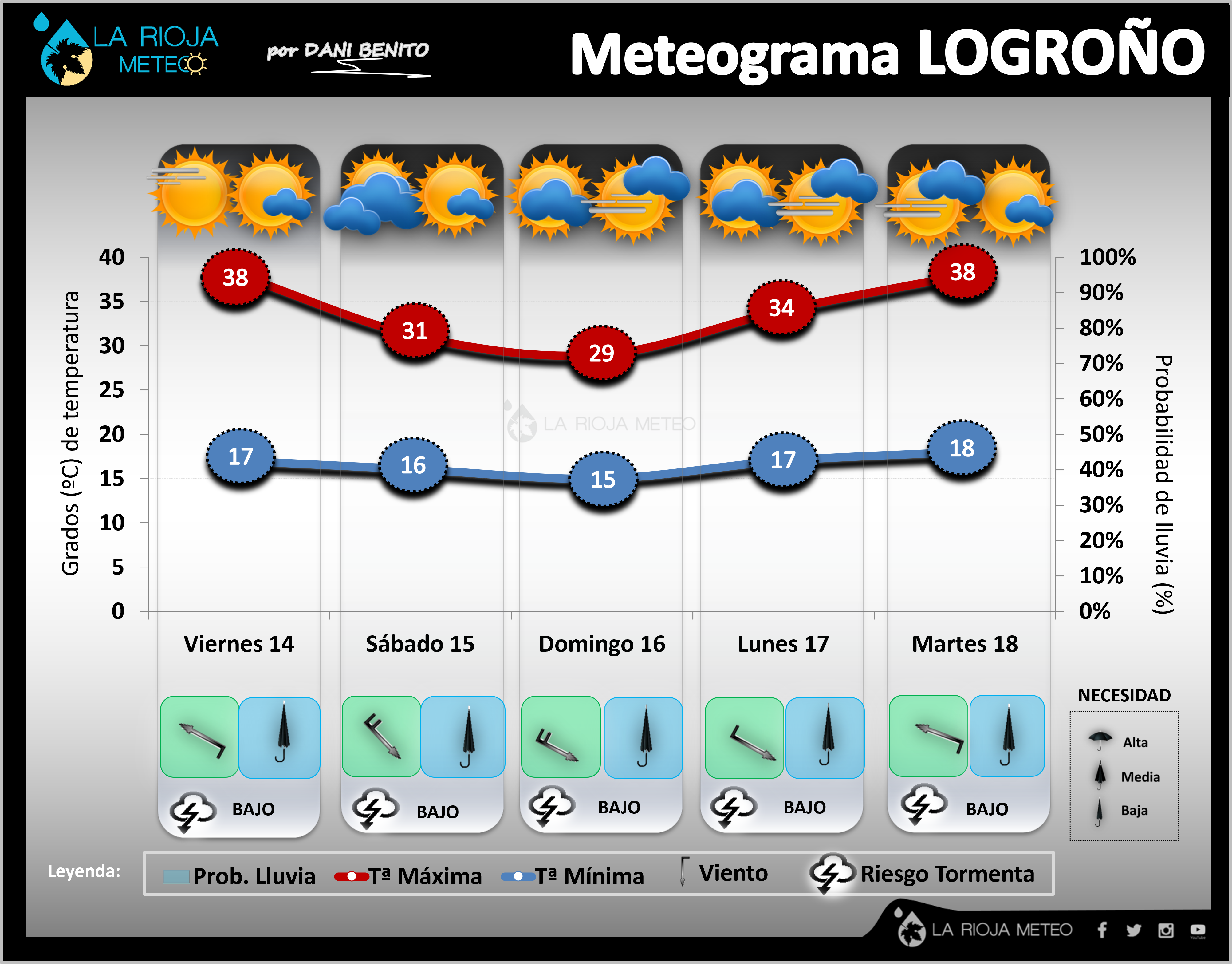 El descuelgue de una borrasca al Oeste de las Islas Británicas y una cresta anticiclónica procedente de la dorsal anticiclónica norteafricana favorecerán que iniciemos el fin de semana con mucho calor en La Rioja, ya que entre ambos sistemas canalizarán un flujo de componente sur sobre la región que disparará las temperaturas durante el viernes. Sin embargo, el avance de la borrasca hacia el noroeste de Europa moverá una masa de aire más fresca sobre el atlántico y la aparición del anticiclón de Azores en su posición, terminará por echárnosla encima durante el sábado y domingo, refrescando el ambiente y normalizando las temperaturas con rapidez, una vez más, de la mano de nuestro amigo el Cierzo. Pese a que este flujo se mantendrá durante el inicio de la semana que viene, la masa cálida del sur volverá a ganar terreno de manera progresiva durante el lunes y martes, aunque sin llegar a los registros tan elevados que se esperan para este viernes en La Rioja.