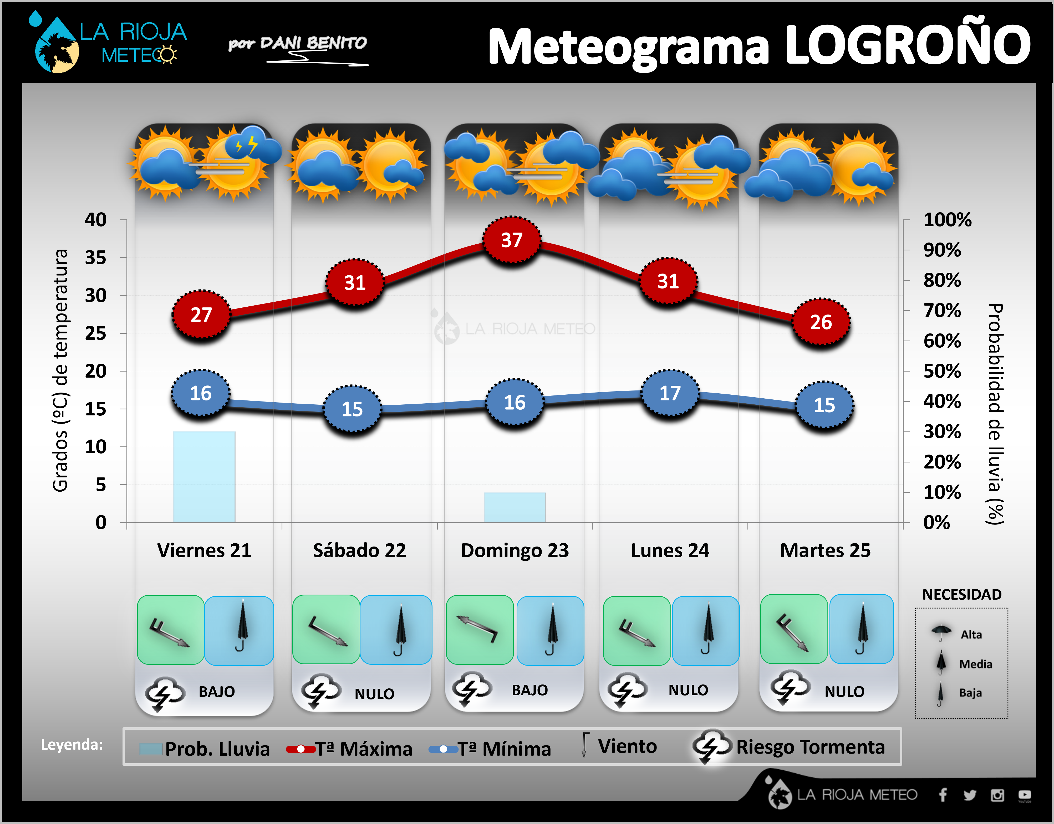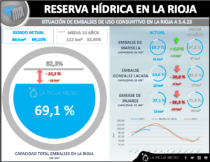 Seguimos con esta dinámica de subidas y bajadas térmicas en La Rioja, vehiculizadas por dos centros de altas presiones que se encuentran a izquierda y derecha de la Penínusla Ibérica y, que entre los cuales, se nos van colando pequeñas vaguadas con frentes asociados, que por un lado producen subidas térmicas prefrontales con riesgo de tormentas y flujo de sur, y bajadas térmicas postfrontales con entrada de Cierzo y estratos de retención en el oeste de la región. Exactamente la situación que se replicará este fin de semana en La Rioja, con el paso de un frente en la segunda mitad del viernes y primeras horas del sábado con vientos del norte, descenso térmico, riesgo de tormentas durante el viernes y nubosidad de retención durante la primera mitad del sábado en la mitad occidental. Situación que cambiará de cara al domingo, con la aproximación de un nuevo frente por el oeste, que en esta ocasión, nos «meterá» sures, que dispararán las temperaturas y mantendrán los cielos menos nubosos. Sin embargo, éste frente llegará a la región durante el lunes, volviendo a marcar un nuevo descenso térmico y repetir el mismo ciclo.