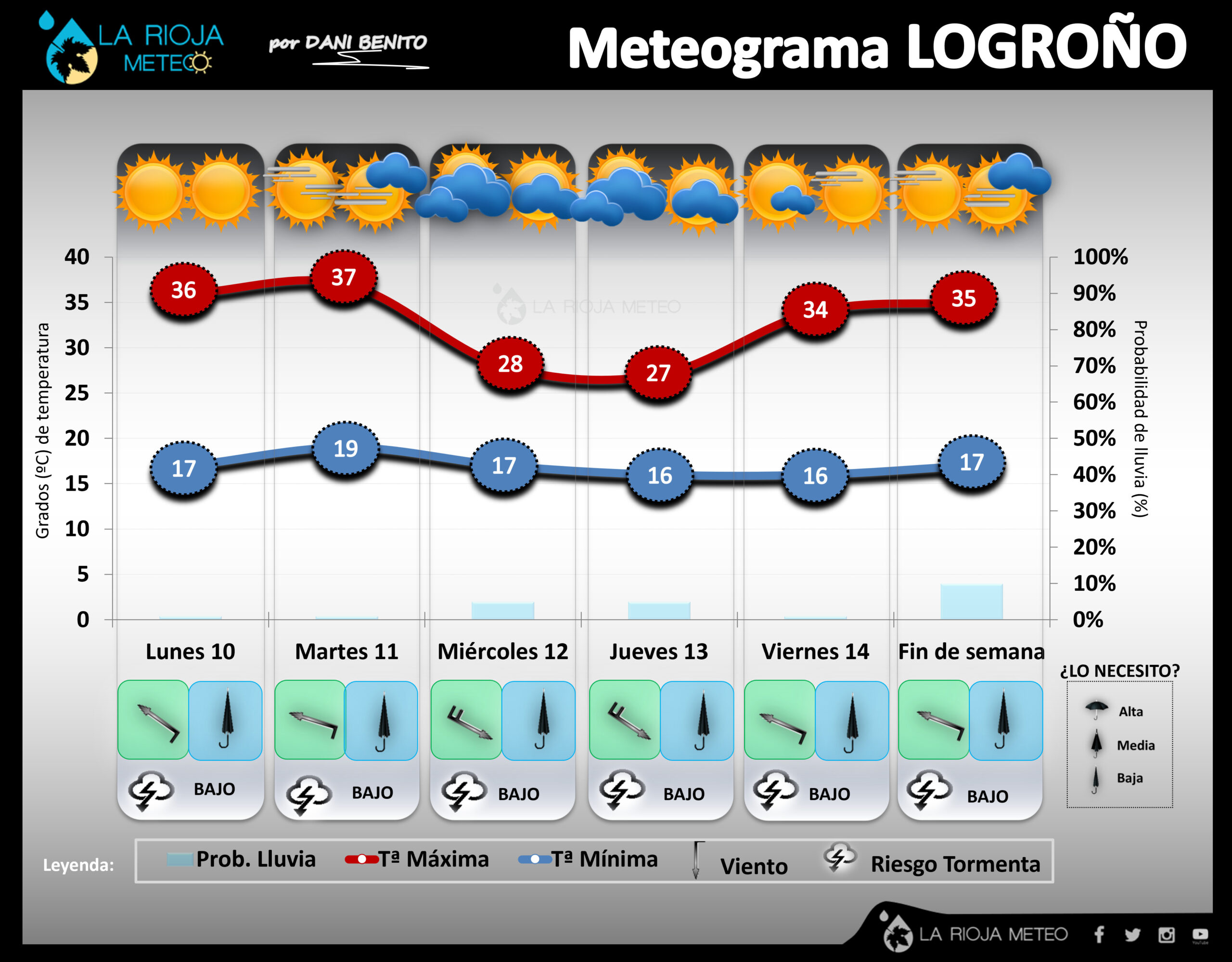 - LUNES 10 Y MARTES 11. La semana se iniciará con un tiempo típico veraniego, con cielos poco nubosos en general, salvo algunos estratos de nubosidad baja matinal que afectarán a las comarcas de Haro y Santo Domingo, especialmente, pero que se disiparán con rapidez. Las temperaturas estarán condicionadas por el flujo de viento, que tenderá a soplar de sureste en las horas centrales, disparando las máximas y de noroeste por la noche, favoreciendo un refrescamiento. Si bien, a las mínimas probablemente le cueste un poco más bajar el mercurio entre la noche del lunes al martes, con mínimas más altas en la ribera (19/21ºC), que las del martes al miércoles, con una entrada evidente de Cierzo que nos dejará dormir mejor (15/17ºC). En lo que respecta a las máximas, oscilarán en la ribera entre los 36/38ºC ambas jornadas, aunque el martes, tras el pico en las primeras horas de la tarde, el Cierzo las hará bajar desde media tarde. En municipios de la Ibérica las máximas rondaran los 30/32ºC, mientras que las mínimas osiclarán en torno a 15ºC. No se descartan algunas tormentas secas en áreas montañosas.