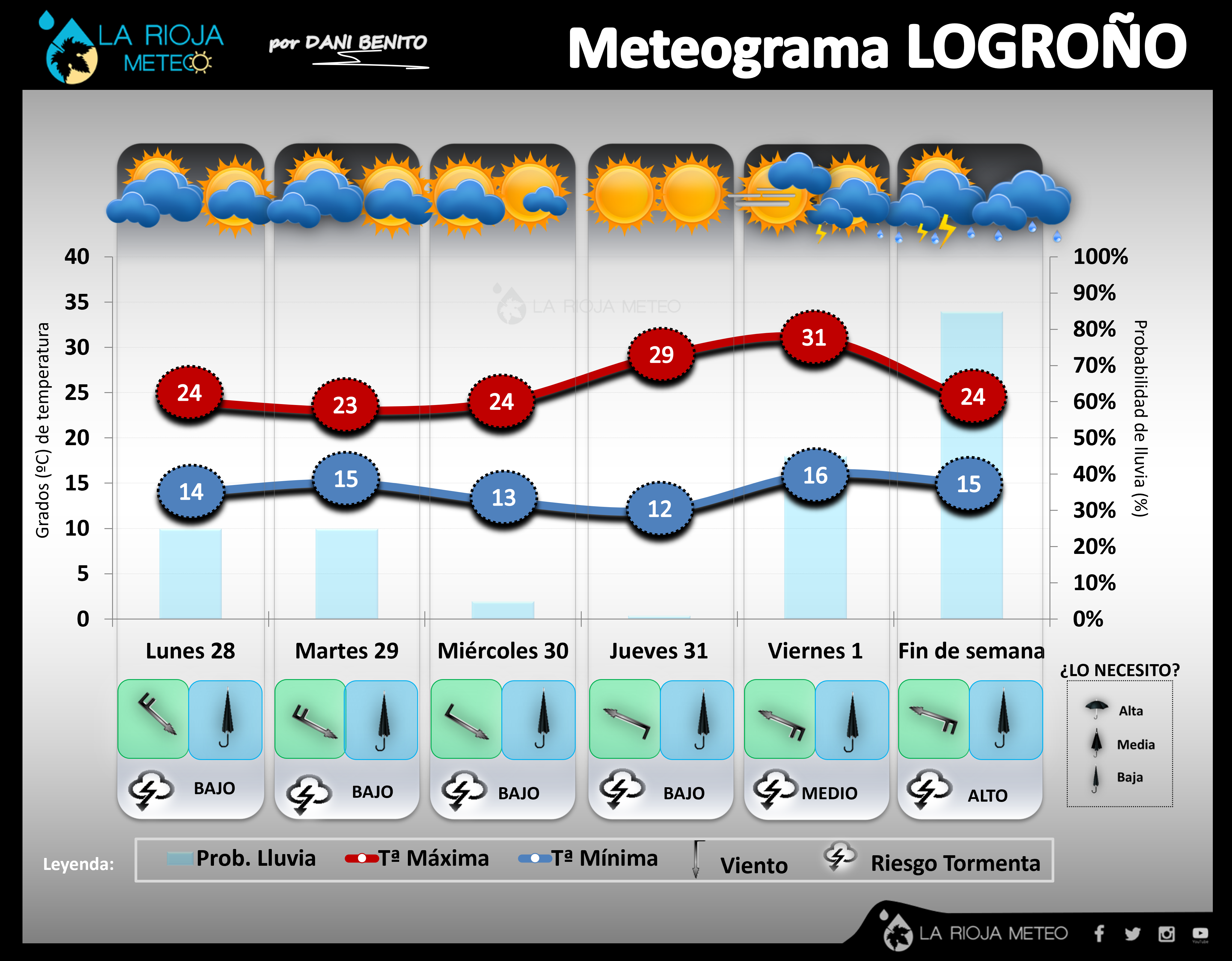 El posicionamiento del anticiclón de Azores en su posición y verticalizado hacia el atlántico norte, favorecerá que sigamos manteniendo un flujo de componente norte al menos hasta el miércoles, marcando un tiempo condicionado por la nubosidad, bajas temperaturas y riesgo de chubascos en la región, especialmente en áreas de montaña. El tablero cambiará de cara al jueves con la entrada de una cuña anticiclónica temporal que traerá una ascenso térmico asociado entre el jueves y viernes y una estabilización del tiempo. Sin embargo, la cada vez más probable aproximación de una DANA por el Oeste durante el fin de semana volverá a traer un cambio de tiempo significativo en La Rioja, con tormentas que podrían producirse ya en la segunda mitad del viernes, pero que se generalizarían el sábado y domingo, aumentando en extensión e intensidad. Ahora mismo sería el escenario más probable aunque habrá que ir siguiendolo.