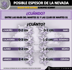 - Comarca del Camero Viejo (Cuenca alta del Leza y Jubera): Ajamil registró 44 litros mientras que Santa Marina se quedó en los 27 litros; cerca Laguna de Cameros con 25 litros, seguido del Monte Cerroyera con 23. Santa Engracia por su parte registró casi 19 litros. San Román de Cameros y Leza de rio Leza apenas superaron los 8 litros.