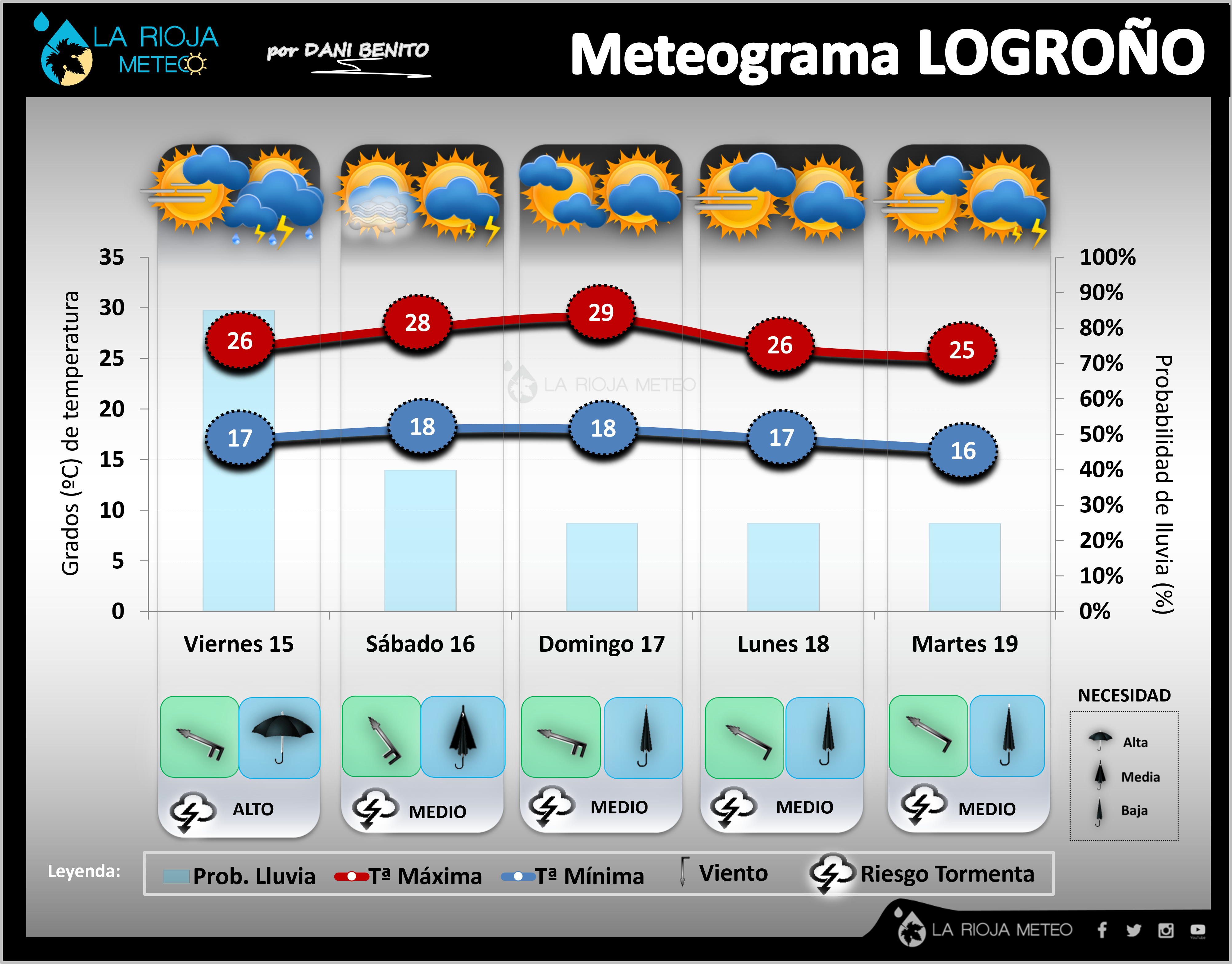 El fin de semana en La Rioja estará marcado por el ambiente cálido y ventoso, a veces, bochornoso, y el riesgo de tormentas, que, aunque no se puedan descartar ningún día, serán más probables y frecuentes durante la jornada de este viernes. De tal forma, las diferentes fiestas que se celebran este fin de semana en la región, incluido el inicio de San Mateo, no deberían preocuparse por el cielo, al menos durante este sábado y domingo. No obstante, como siempre digo, hay que seguir las actualizaciones…pues un ligero cambio en la trayectoria de esa BFA, podría trasladar la distribución de las precipitaciones y su intensidad.