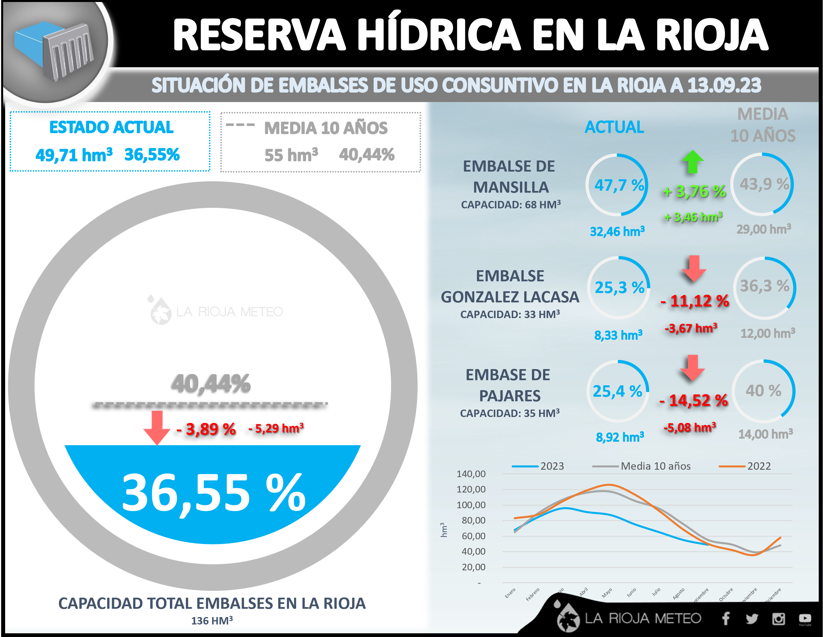 Estos datos ponen en evidencia que las lluvias de las últimas semanas, han beneficiado a las cuencas del alto Iregua, que apenas han perdido capacidad (pese a su peor situación comparativa con la media de los últimos 10 años). A estas alturas y con lo que hemos vivido, no perder mucho es casi como ganar….veremos como se sigue comportando el mes de septiembre, que de momento se está llevando los puentes en algunas localidades riojanas.