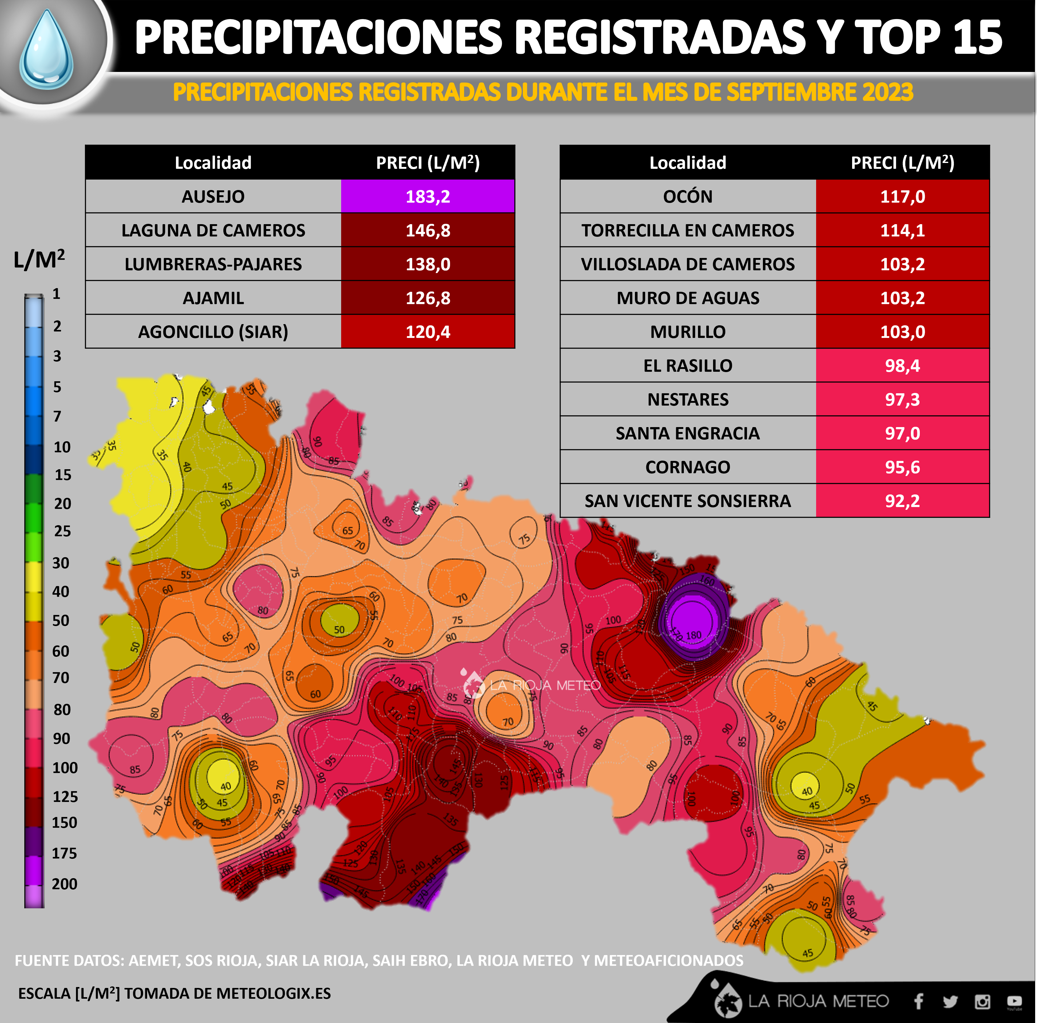 En base al informe climatológico de Septiembre de AEMET La Rioja, el mes tuvo un carácter EXTREMADAMENTE HÚMEDO en toda la comunidad. En el conjunto de la región se doblaron, como poco, las precipitaciones climatológicamente normales para este mes. Destacando la comarca de Arnedo, Camero Viejo y el Este de la comarca de Logroño, con valores que triplican los registros que habitualmente se tienen en este mes en la región.