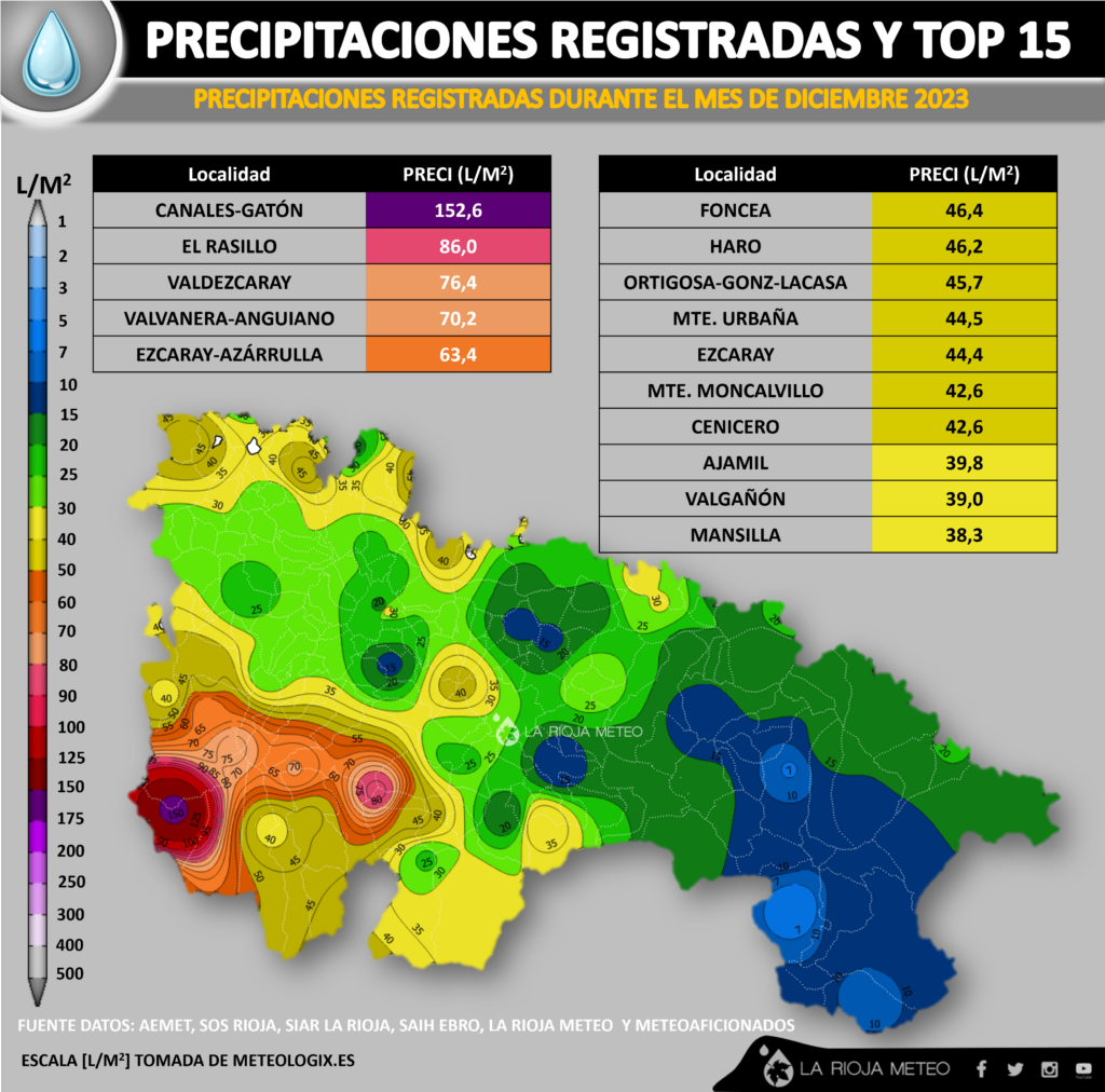 Y es que se han llegado a rondar los 150 litros en algunas zonas de la montaña riojana, especialmente en la cabecera del rio Gatón (Canales de la Sierra) con más de 152 litros, aunque Valdezcaray esta vez apenas supero los 85 litros. Observamos en el mapa pluviométrico de Diciembre, como las zonas de la comunidad que más penalizadas se han visto por este efecto son las comarcas de Cervera, Arnedo y Alfaro con acumulados de 5/15 litros de media en las tres comarcas. Además también podemos observar cierto efecto pantalla a rebufo del Moncalvillo (áreas del bajo Iregua) o del Camero Viejo.