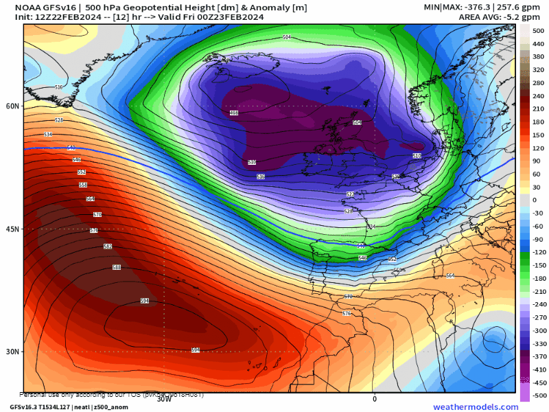 A lo largo del fin de semana seguiremos bajo su radio de acción, aunque su ángulo de acción sobre nosotros irá cambiando por el acercamiento de una nueva borrasca que volverá a hacer diana sobre nosotros entre el domingo y el miércoles que viene. De tal manera, los vientos del Oeste arreciarán el viernes, para rolar ligeramente a Noroeste el sábado (Cierzo) y volver a rolar a Oeste/SurOEste a partir del domingo con rachas MUY FUERTES. Estos cambios en la componente del viento tendrá su reflejo en la intensidad de las precipitaciones, en la localización de la incidencia de éstas, además de marcar cierto vaivén térmico (frío el viernes y sábado, y ascenso térmico el domingo) que terminará fijando un marcado descenso de cara a la semana que viene con una típica situación de norte….pero lo iremos viendo.