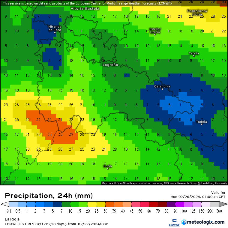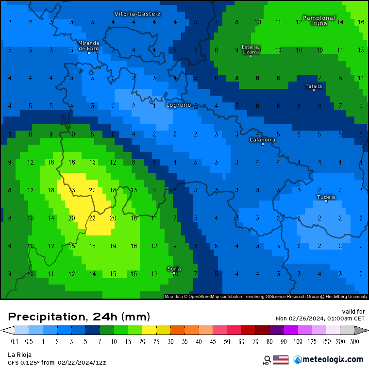- VIERNES 23 DE FEBRERO. Ambos modelos se parecen bastante, dando los mayores acumulados en la Ibérica occidental (10/12 litros) y siendo bastante más escuetos en el resto de la región (entre 1/4 litros), pudiendo despuntar en este caso la ribera alta. Las precipitaciones más probablemente se den en la segunda mitad del día, dejando una mañana algo más tranquila. Respecto a la nieve, la cota rondará los 800 metros, con nevadas dispersas a esa altitud, salvo algo más intensas en la Ibérica occidental donde se podrían acumular 3/5 cm por encima de 1000/1200 metros, fundamentalmente en la Demanda y Urbión.